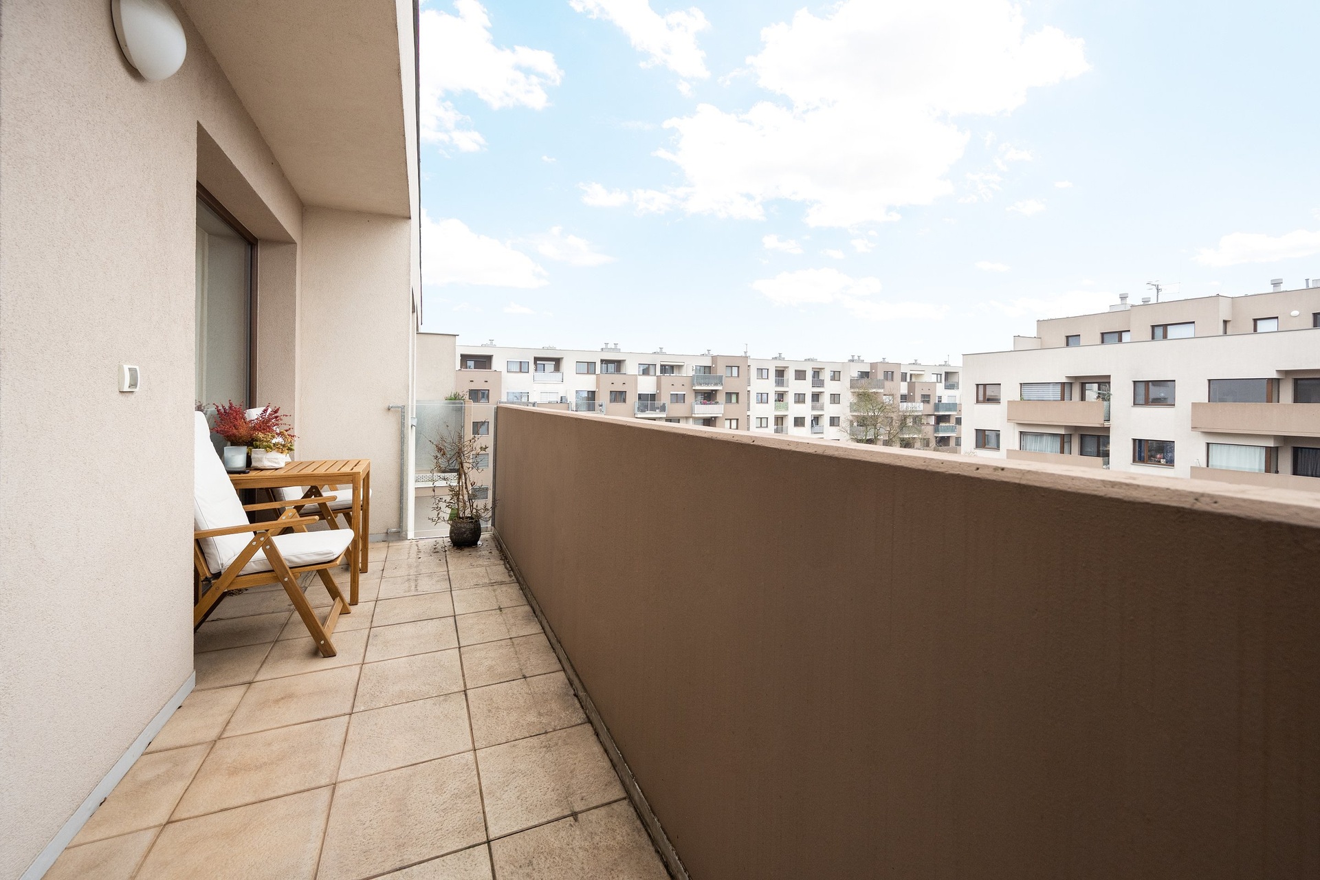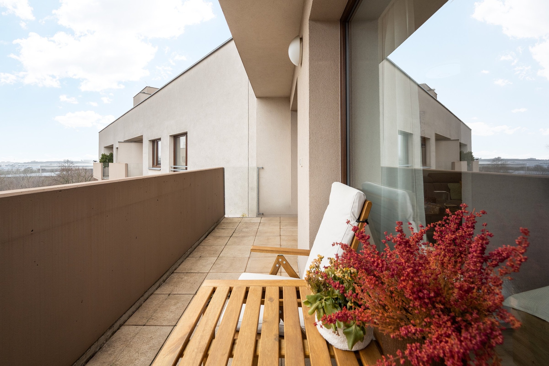 Lodžie o výměře 7,7 m2 je po celé šířce obytného prostoru. Velkými okny proniká do bytu dostatek světla a pokoje působí vzdušně a čistě. Venkovní prostor je dostatečně široký k umístění venkovního nábytku a klidnému odpočinku s výhledem. V okně je praktická síť proti hmyzu.