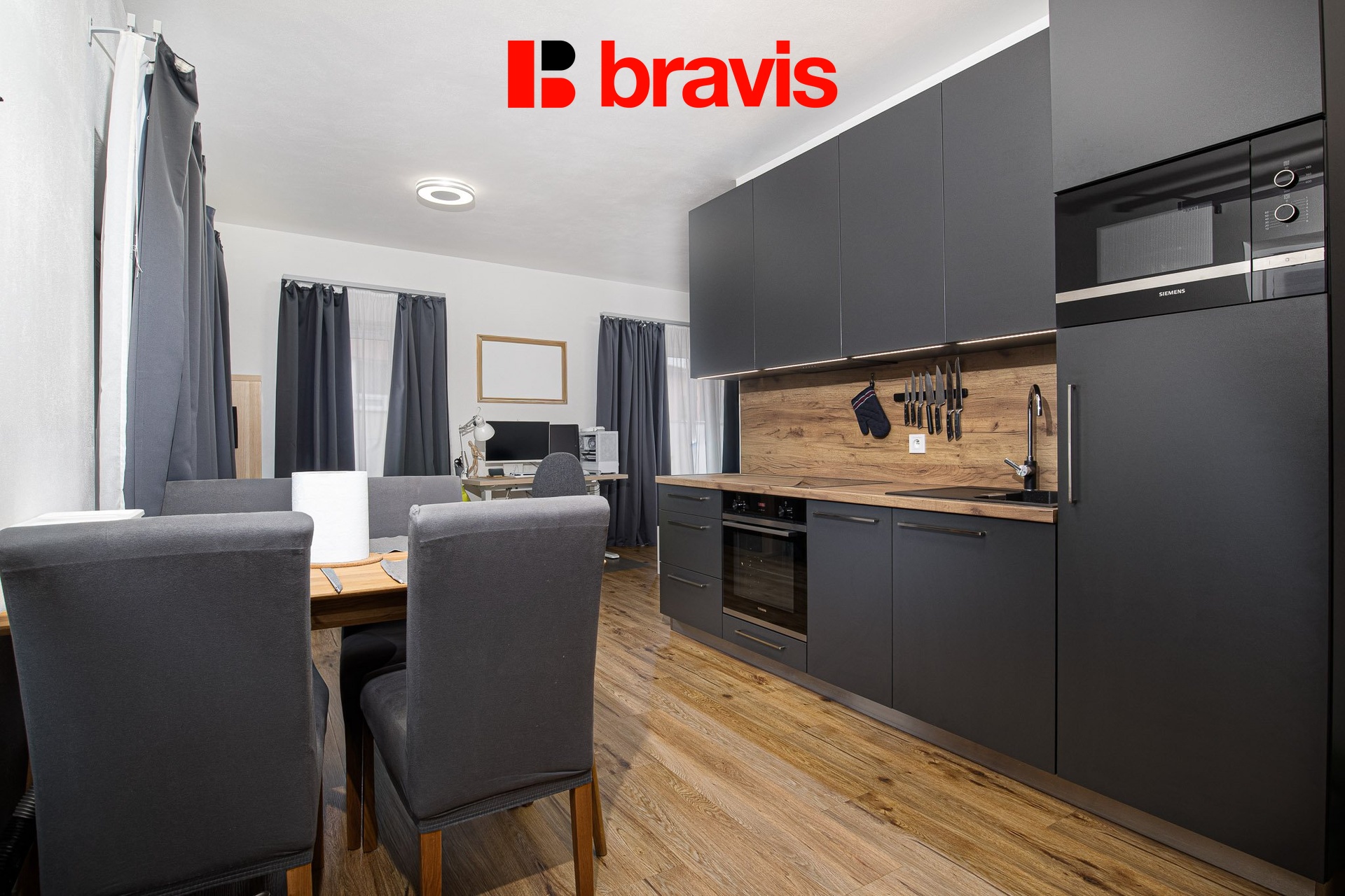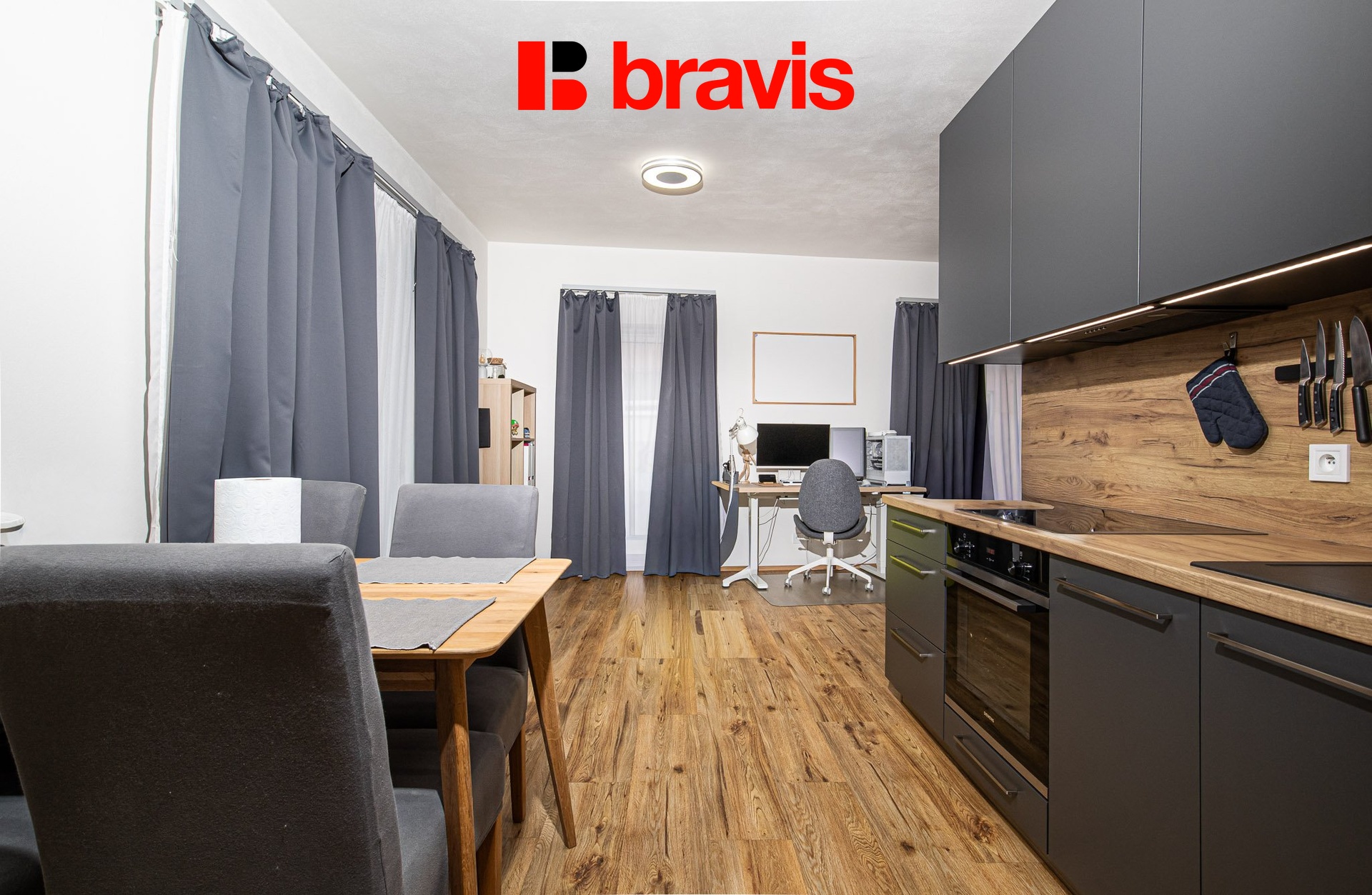 Dominantou bytu je prostorný obytný prostor s kuchyňským koutem, který je vybaven moderní kuchyňskou linkou včetně vestavných spotřebičů – lednice s mrazicím boxem, trouby, varné desky, digestoře, mikrovlnné trouby a myčky. Díky velikosti místnosti nabízí prostor dostatek místa jak pro obývací, tak i spací část.