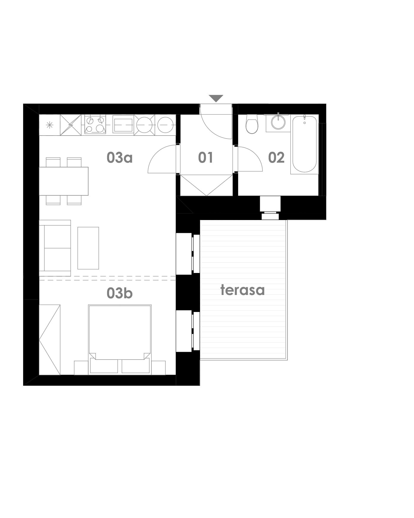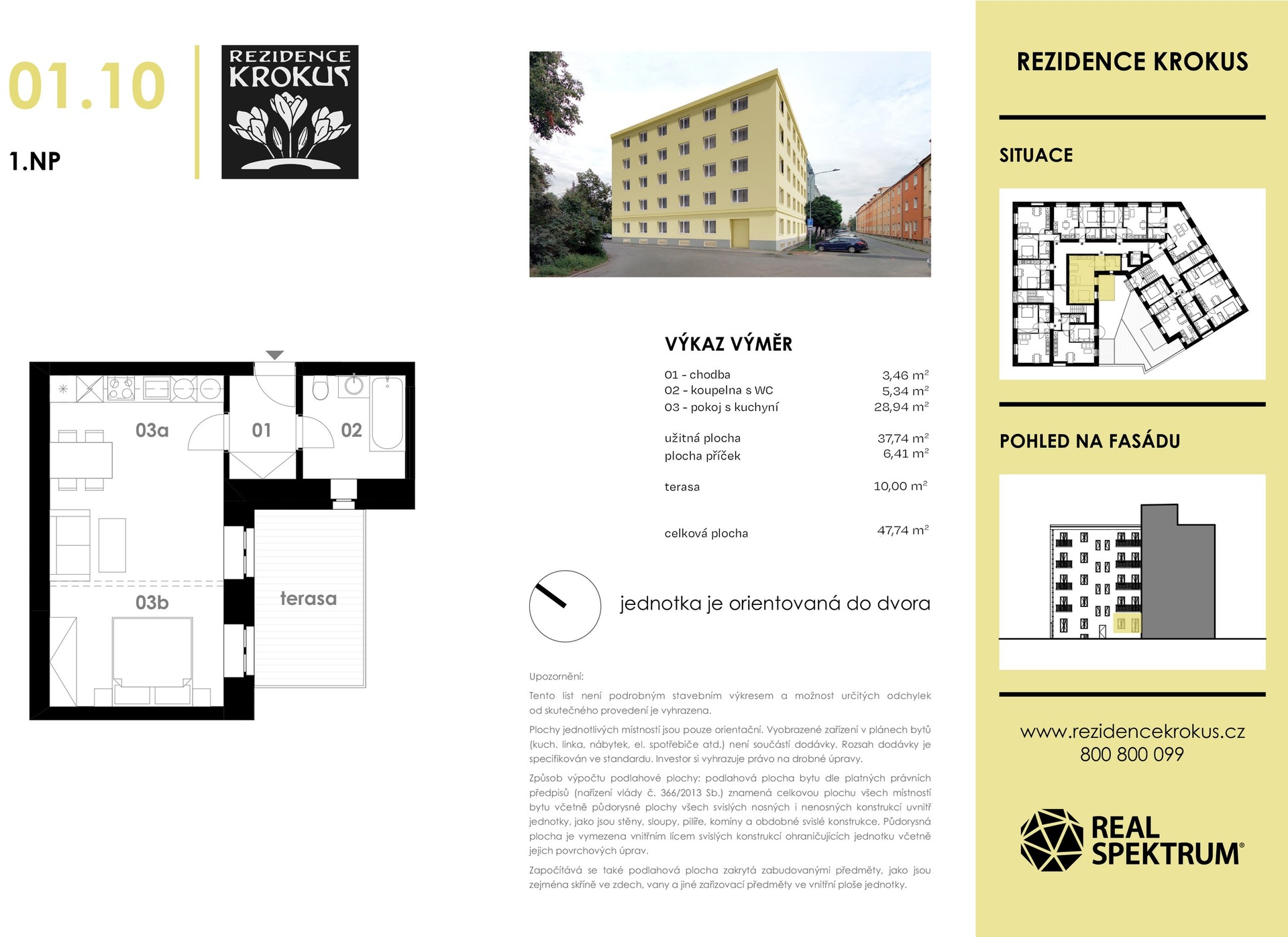 Dispozice bytu: vstupní chodba (3,46 m²), obývací pokoj s kuchyňským koutem (28,94 m²), koupelna s WC (5,34 m²), terasa (10,00m²)