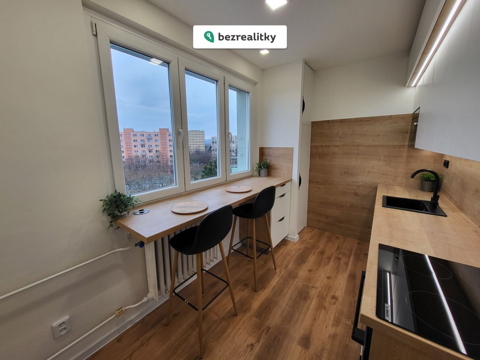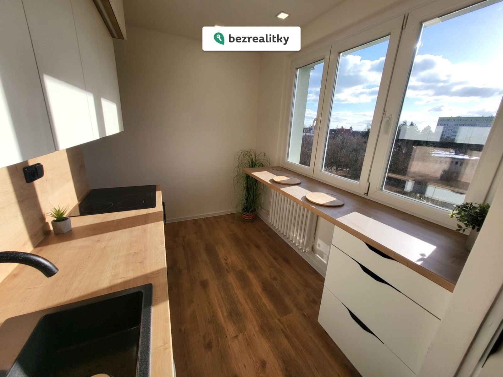 Součástí bytu je nová kuchyňská linka vyrobená na míru a vestavné spotřebiče značky Bosch (trouba, indukční varná deska, mikrovlnka) a Electrolux (myčka), digestoř a granitový dřez. Příprava na pračku a vestavná spíž.
