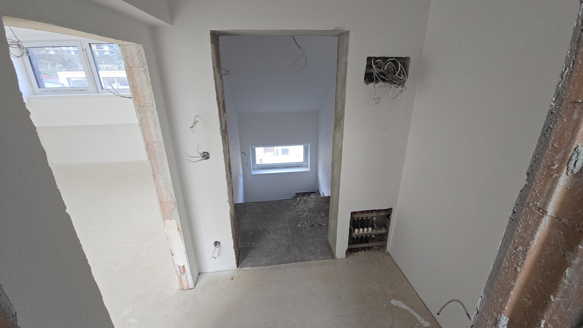 Dispozičně 2+KK (dělicí příčka se ještě bude dodělávat), ideální pro jednotlivce nebo pár. Obývací část s kuchyní (dodáváme standardně bez kuchyňské linky) a vstupem na balkon. Předsíňka s prostorem pro pračku a úložné prostory a koupelna s vanou (změna oproti projektu z půdorysu).