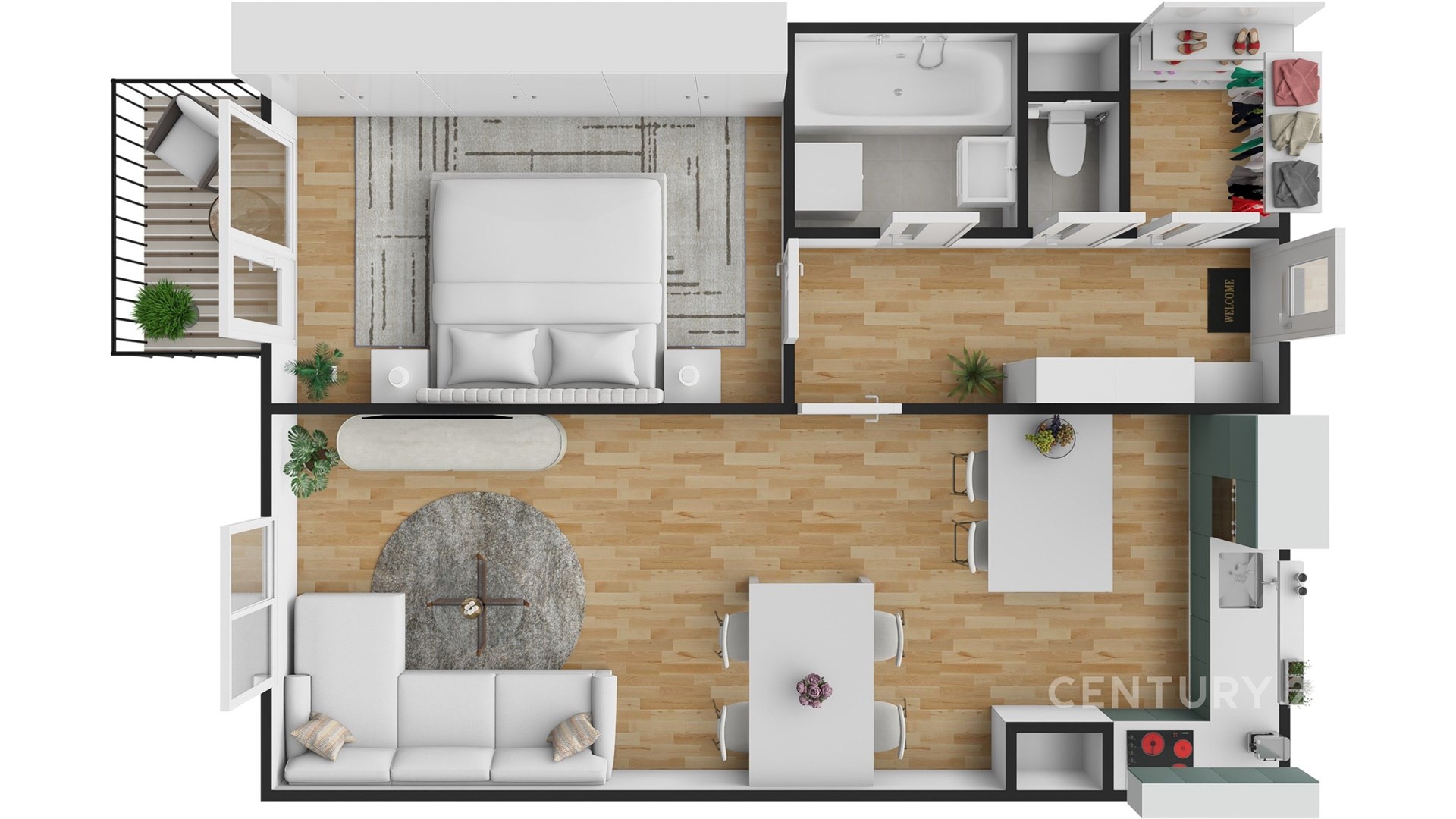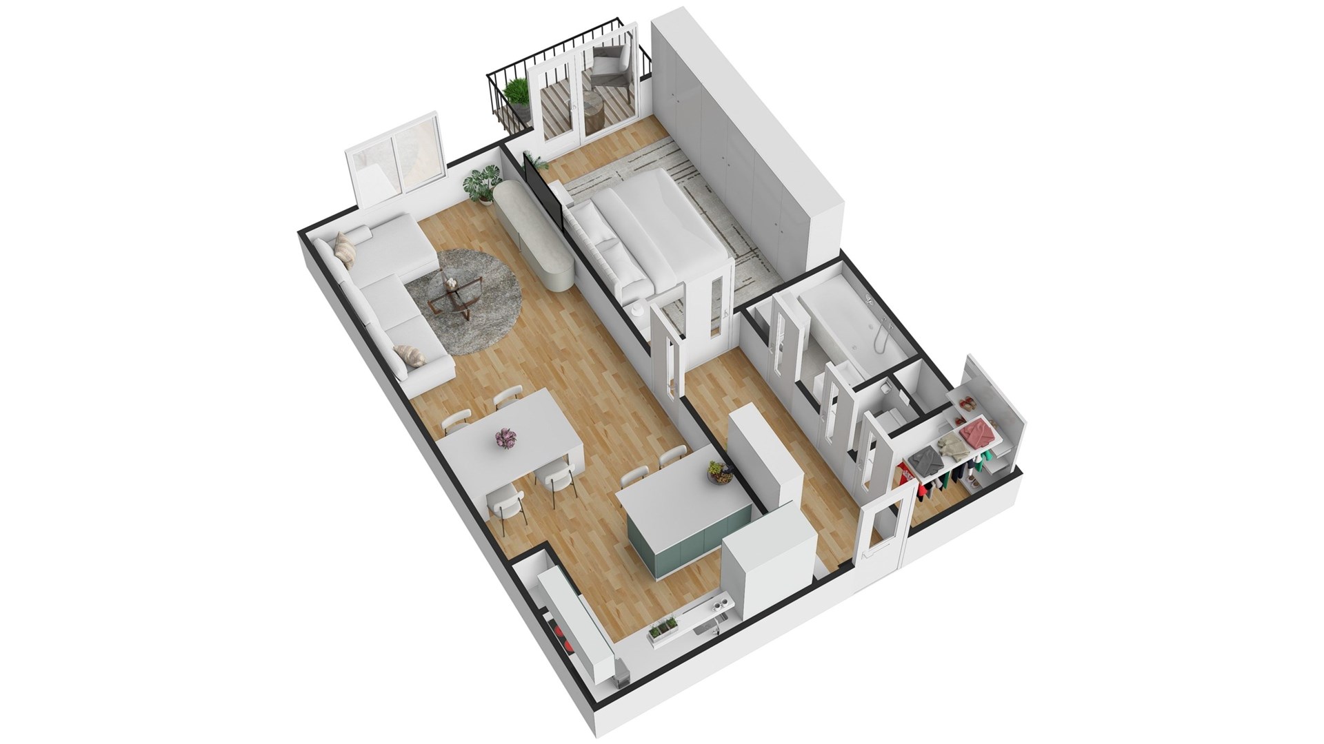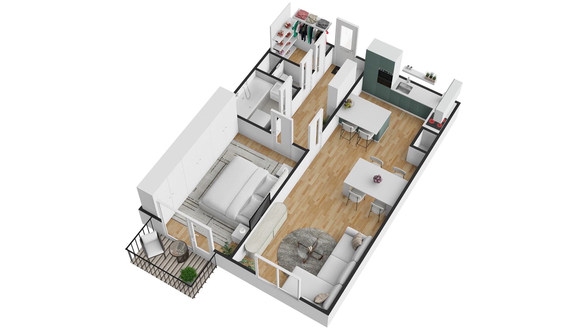 Dispozice bytu je velmi praktická a promyšlená. Vstupní chodba o velikosti 6,31 m² plynule navazuje na šatnu (2,21 m²), která zajišťuje dostatek úložného prostoru. Koupelna má 3,32 m², samostatné WC 0,88 m². Ložnice o výměře 14,85 m² poskytuje klidné zázemí, zatímco obývací pokoj s kuchyňským koutem o ploše 29,13 m² tvoří otevřený a vzdušný prostor pro každodenní život. Příjemným doplňkem je balkon o velikosti 2,88 m², ideální pro relaxaci.