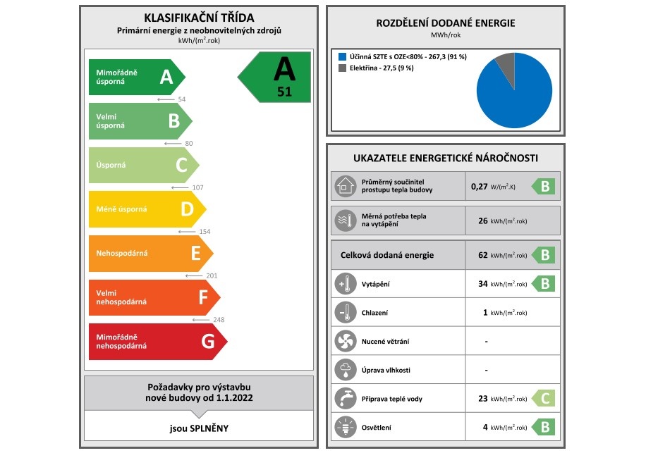 - Ukazatel energetické náročnosti budovy: 51 kWh/m²