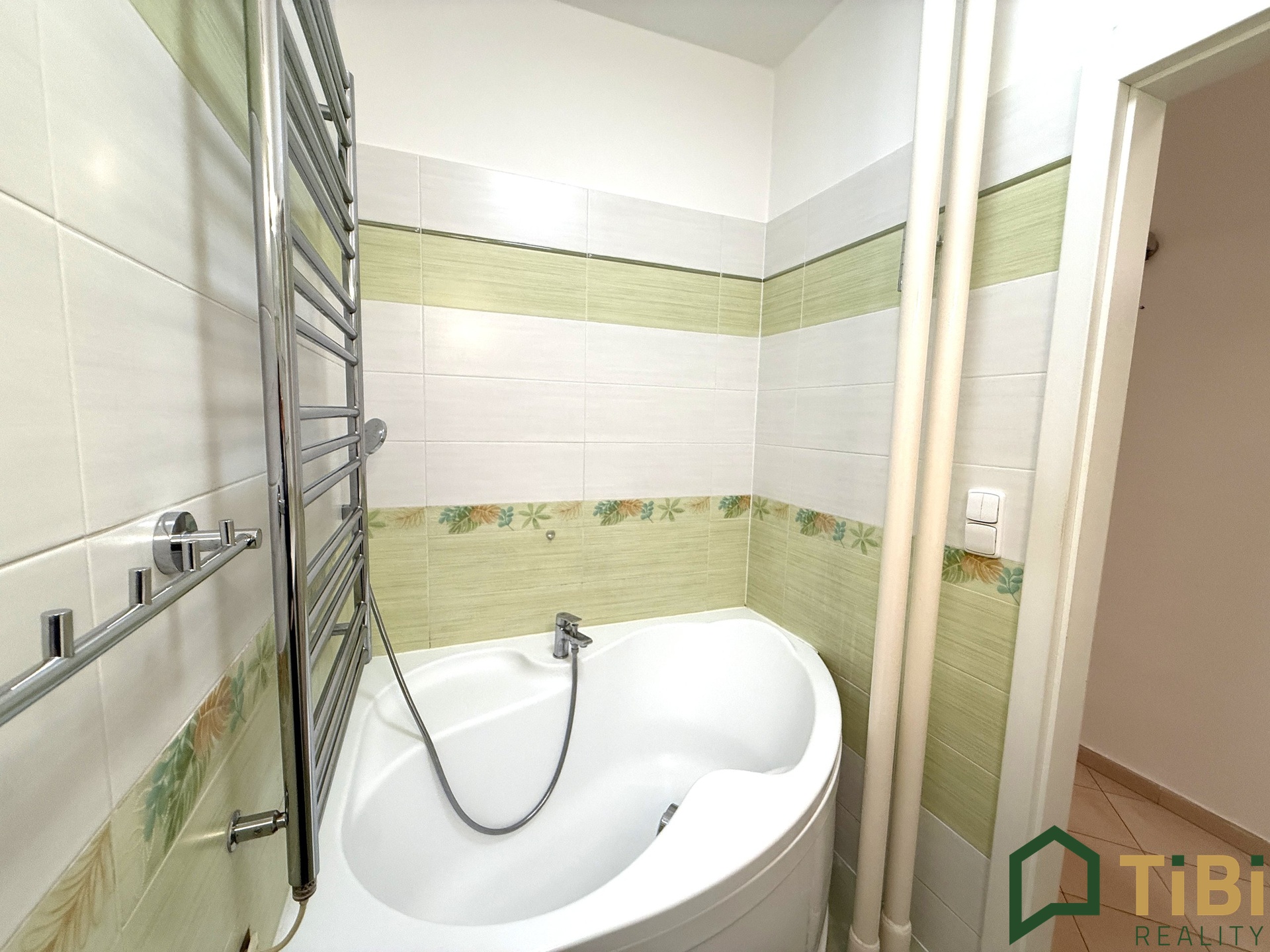 Koupelna je laděna do optimistických pastelových barev, je vybavena vanou. WC je samostatné.