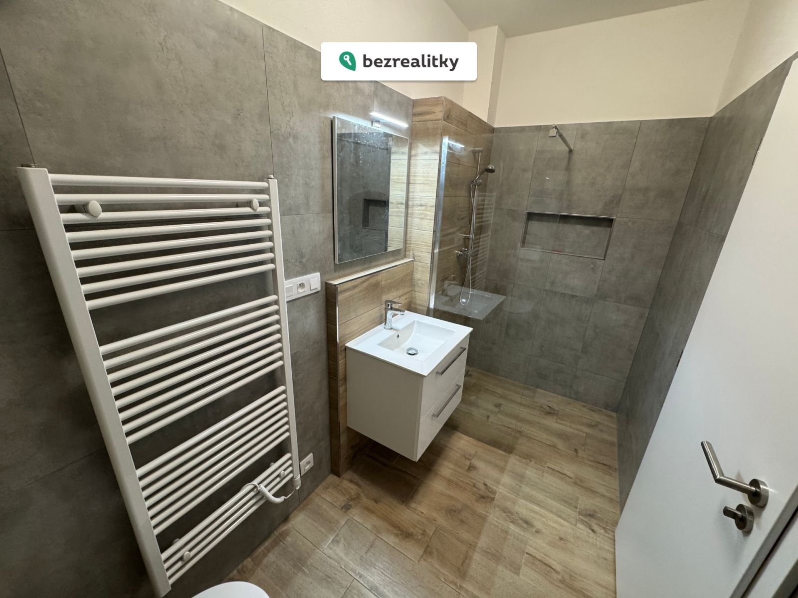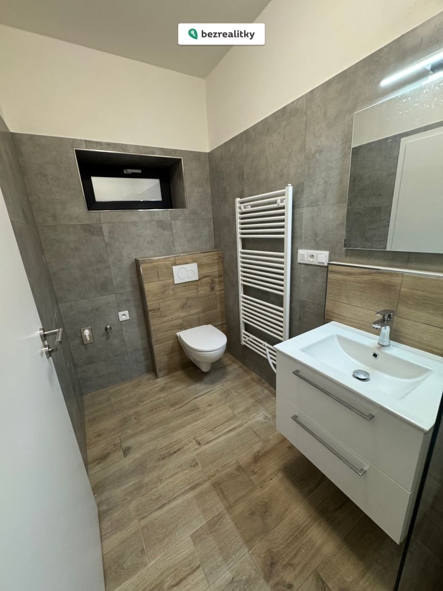 Odvětrání je mimo byt. Koupelna je moderní se sprchovým koutem a osvětleným zrcadlem. Dlažba a její velkoformátová velikost je nadčasová. V bytě jsou 3 pokoje, v jednom z nich může být obývák s kuchyňským koutem. Centrální vytápění je tepelným čerpadlem a dům je celkově energeticky velice úsporný. Voda, elektřina i měření tepla má samostatná měřidla.