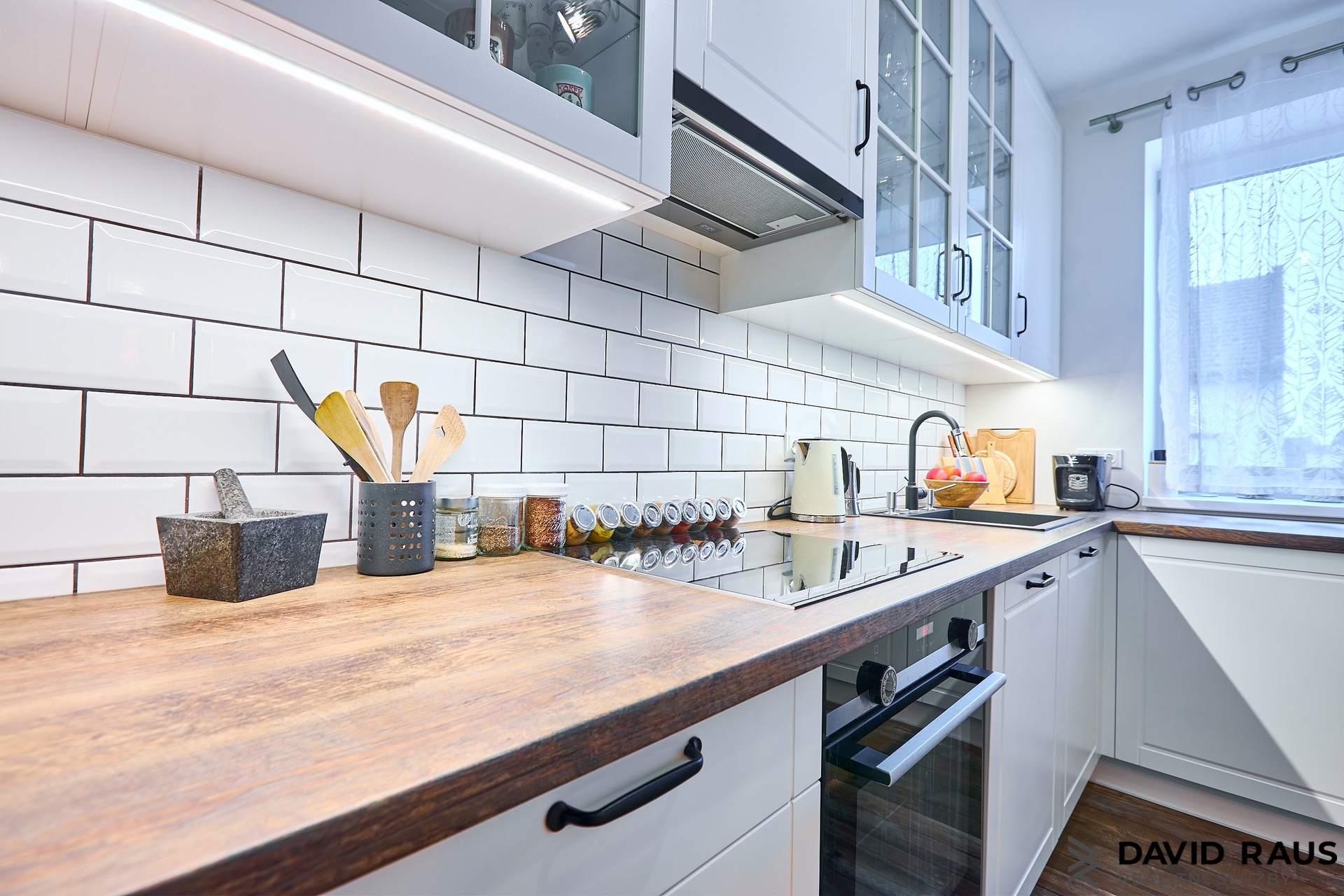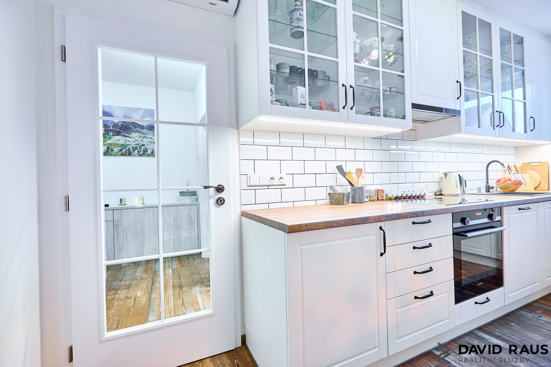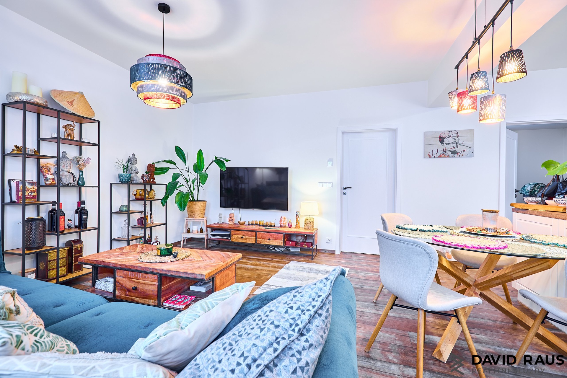 Prosklenými dveřmi vstoupíte do hlavního obytného prostoru, který tvoří obývací pokoj s kuchyňským koutem o výměře 32,6 m². Kuchyňská část je přirozeně oddělena designovým pultem navazujícím na kuchyňskou linku, což vytváří funkční a přehledné uspořádání prostoru. Součástí kuchyně je také samostatná americká lednice s vestavěným výrobníkem ledu.