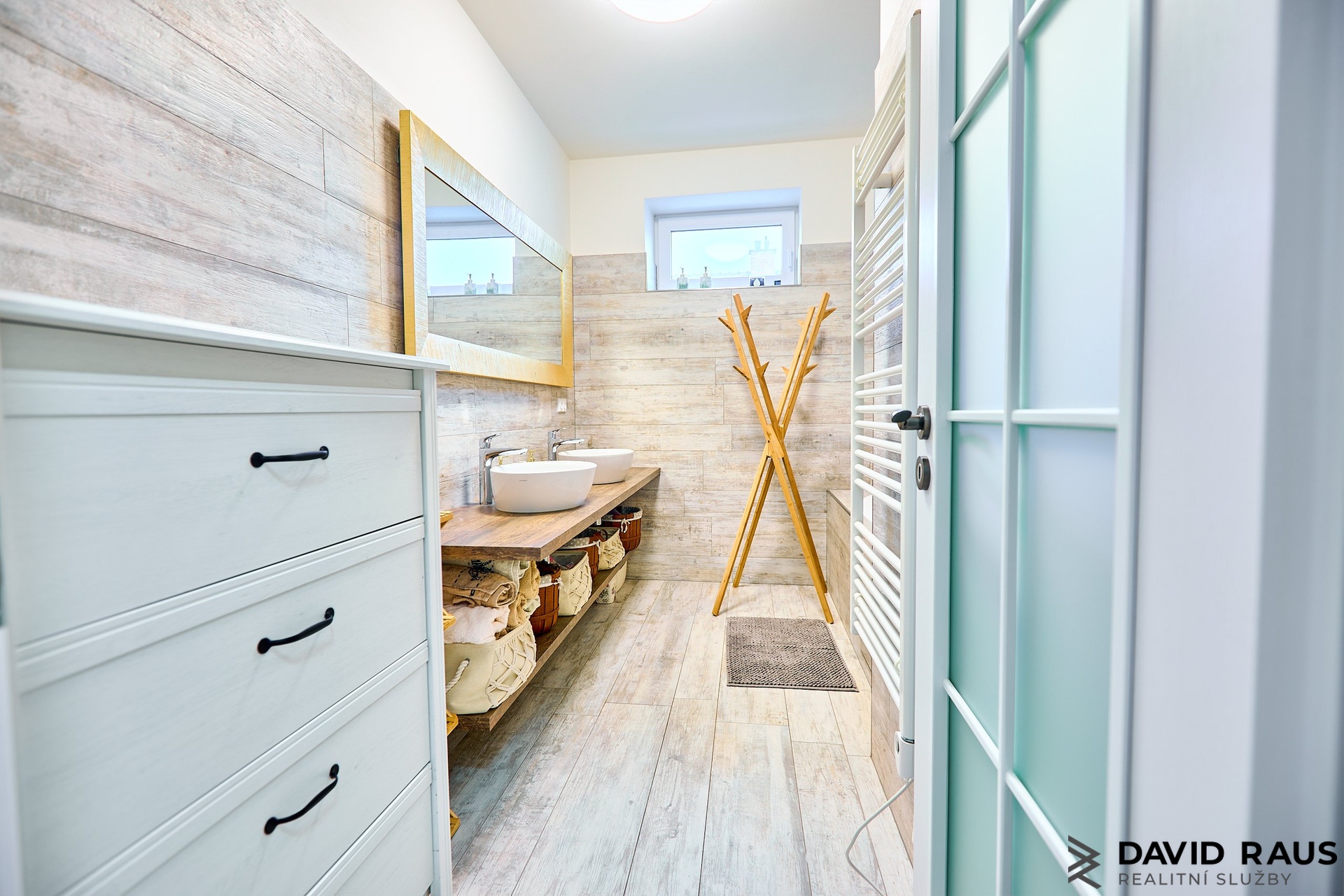 Po vstupu do bytu se ocitnete v předsíni o velikosti 7,40 m², kde jsou vestavěné skříně poskytující dostatek úložného prostoru. Z předsíně se plynule dostanete do všech dalších částí bytu. Nejprve míjíte samostatné WC o výměře 1,50 m² a následně vstupujete do koupelny o velikosti 7,20 m². Koupelna je vybavena vanou a dvěma samostatnými umyvadly umístěnými na desce vyrobené na míru, pod kterou se nachází praktický úložný prostor. Velkou výhodou je také okno umístěné ve výšce přibližně 1,80 m, které zajišťuje přirozené světlo i možnost větrání.