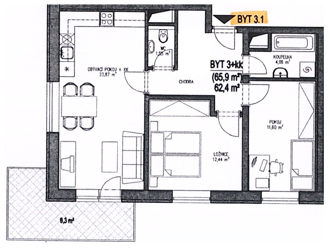 - Dispozice bytu: 3+kk