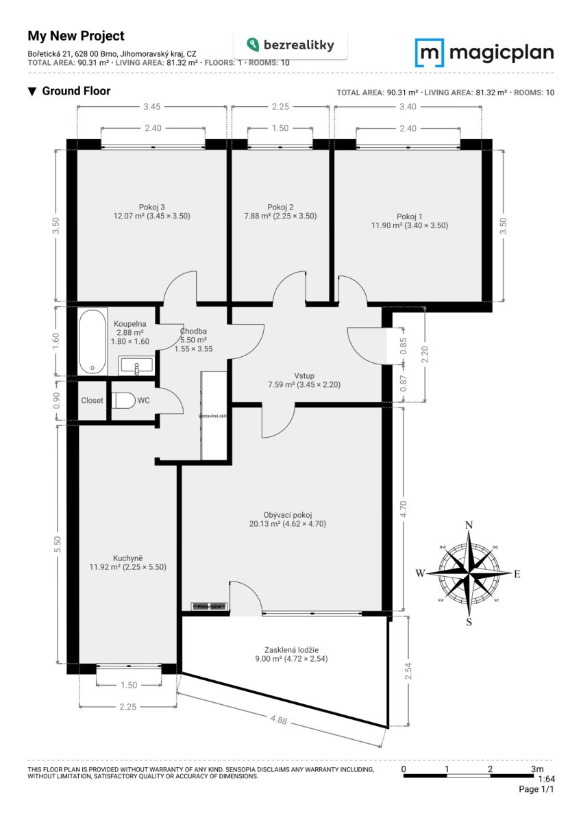 Všechny pokoje jsou neprůchozí, což zajišťuje dostatek soukromí pro rodinu i možnost pronájmu jednotlivých pokojů. Obývací pokoj a kuchyně jsou orientovány na západ, ložnice a další dva pokoje na sever. Z obývacího pokoje je vstup na prostornou zasklenou lodžii (9 m²). V obývacím pokoji je instalována klimatizační jednotka. V předsíni je vestavěná skříň s prostorem pro pračku. K bytu náleží sklepní kóje (2 m²).