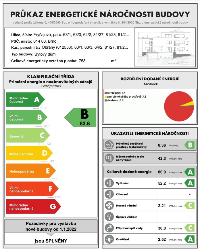 - Ukazatel energetické náročnosti budovy: 63.6 kWh/m²