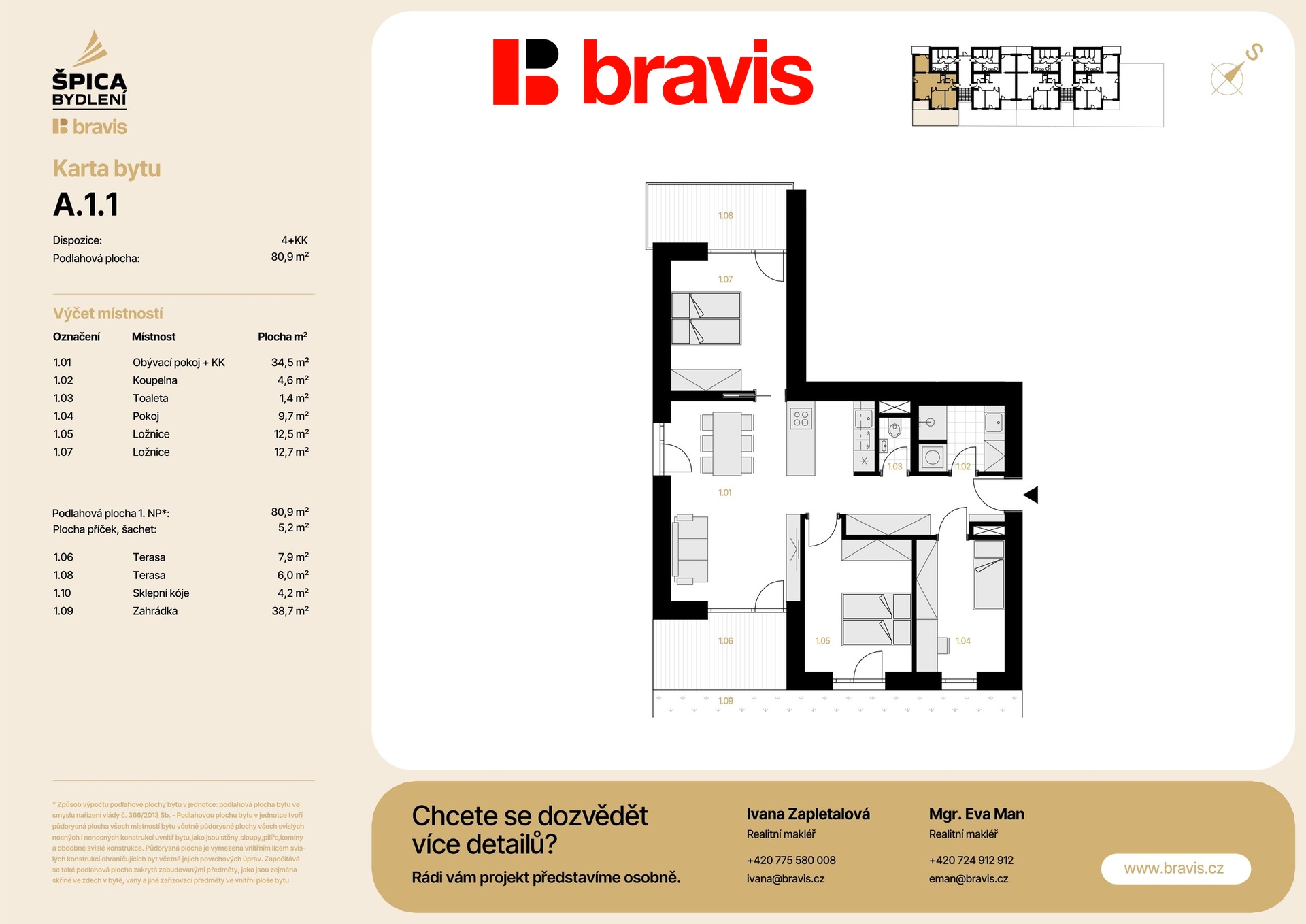 Nabízíme exkluzivní bytovou jednotku 4+kk (bytová jednotka A1-1) v novém projektu Špica bydlení — byt umístěný v přízemí nízkoenergetického bytového domu A. Celková podlahová plocha 80,9 m2 s terasou 14 m2, zahrádkou 38,7 m2.