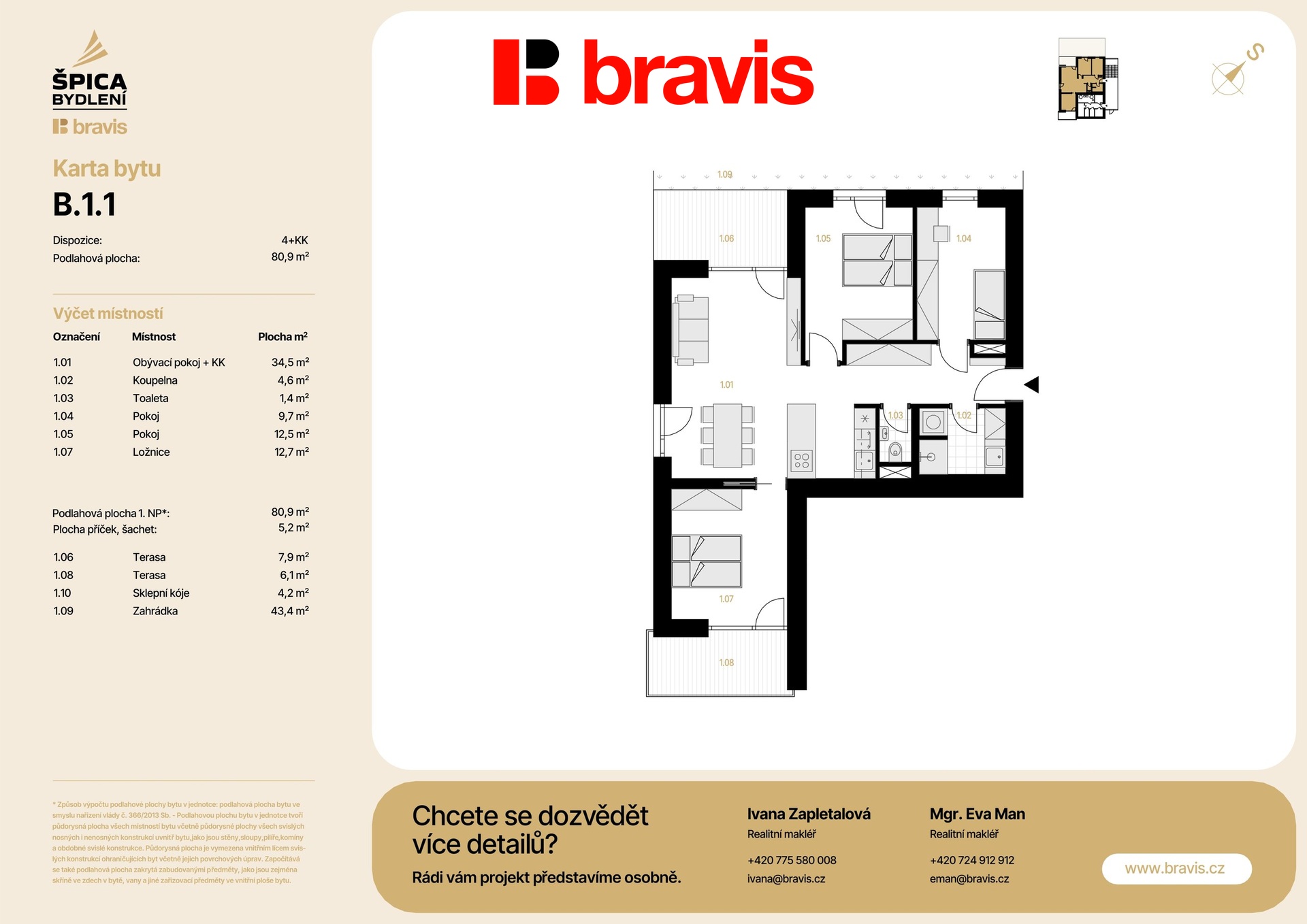 Nabízíme exkluzivní bytovou jednotku 4+kk (bytová jednotka B1-1) v novém projektu Špica bydlení — byt umístěný v přízemí nízkoenergetického bytového domu B, kde se nachází pouze 5 bytových jednotek. Celková podlahová plocha 80,9 m2 s terasou 14 m2, zahrádkou 43,4 m2.