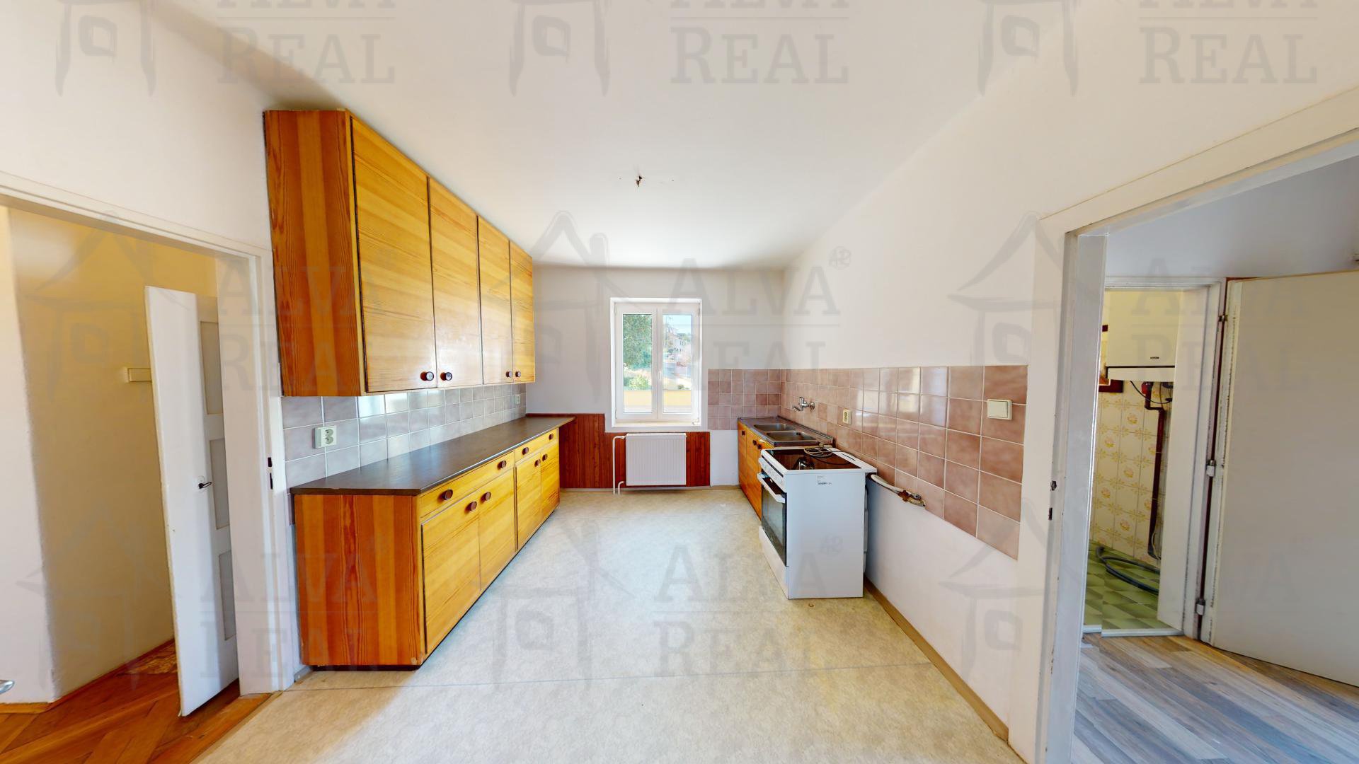Byt je vyklizen, zůstává pouze vybavení dle fotografií - kuchyňská linka, vybavení koupelny, policový regál ve spíži.