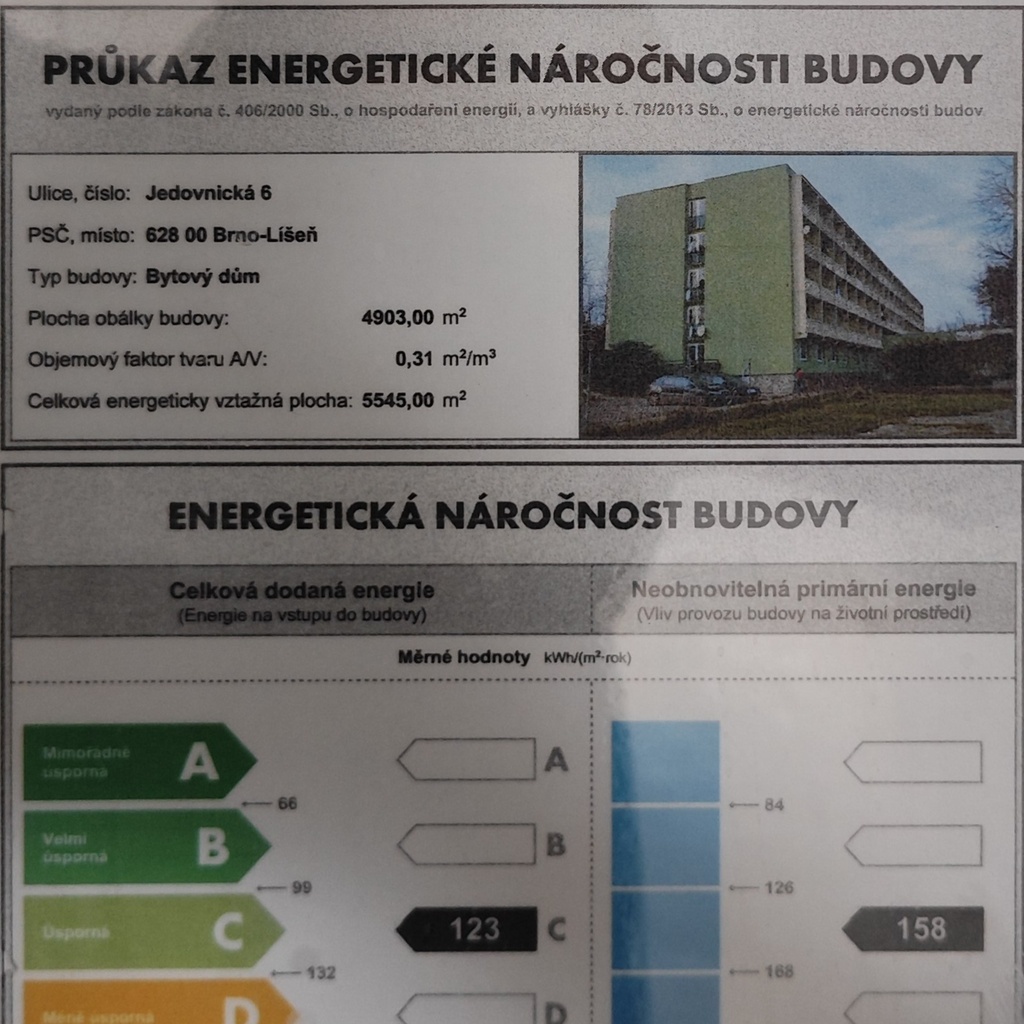 - Ukazatel energetické náročnosti budovy: 123 kWh/m²