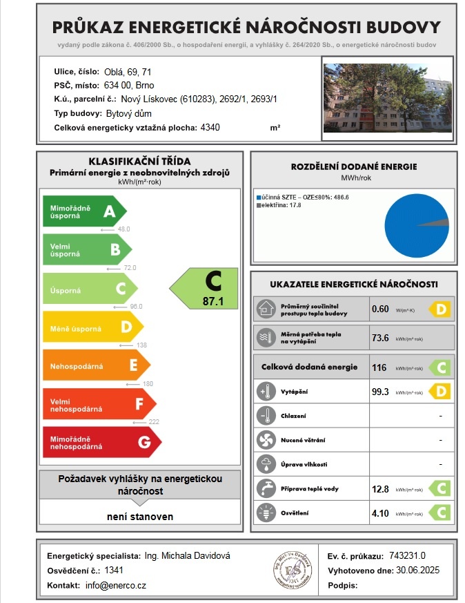 - Ukazatel energetické náročnosti budovy: 87.1 kWh/m²