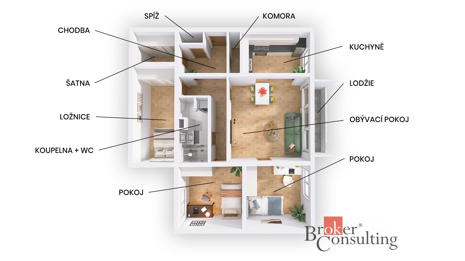Byt se nachází v přízemí panelového domu a disponuje lodžií (cca 4,5 m²) a sklepem (2 m²). Dispozice nabízí dostatek soukromí i úložných prostor (šatna, spíž, technická místnost) a je ideální pro rodinné bydlení i investici k pronájmu.