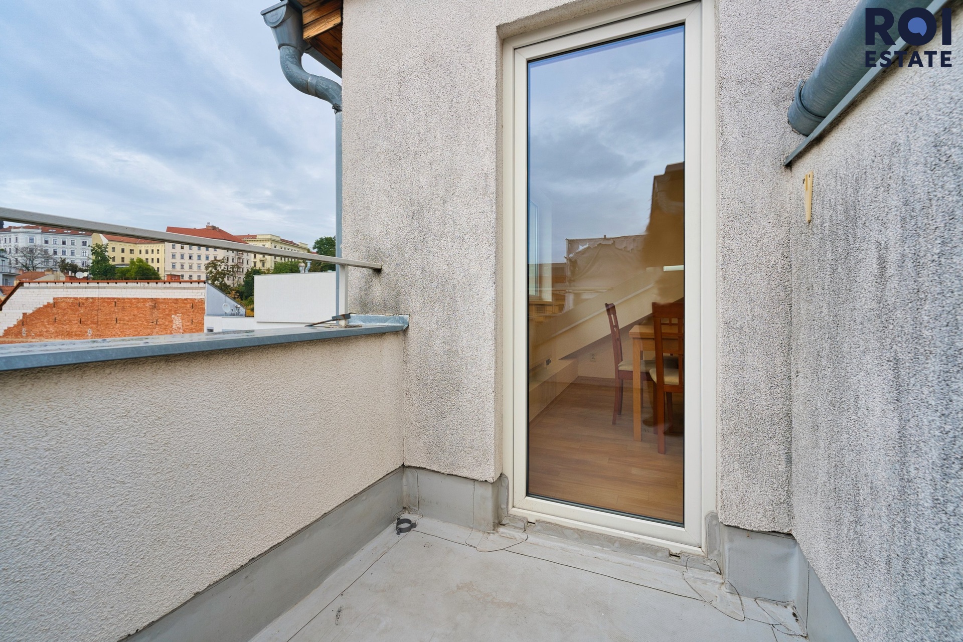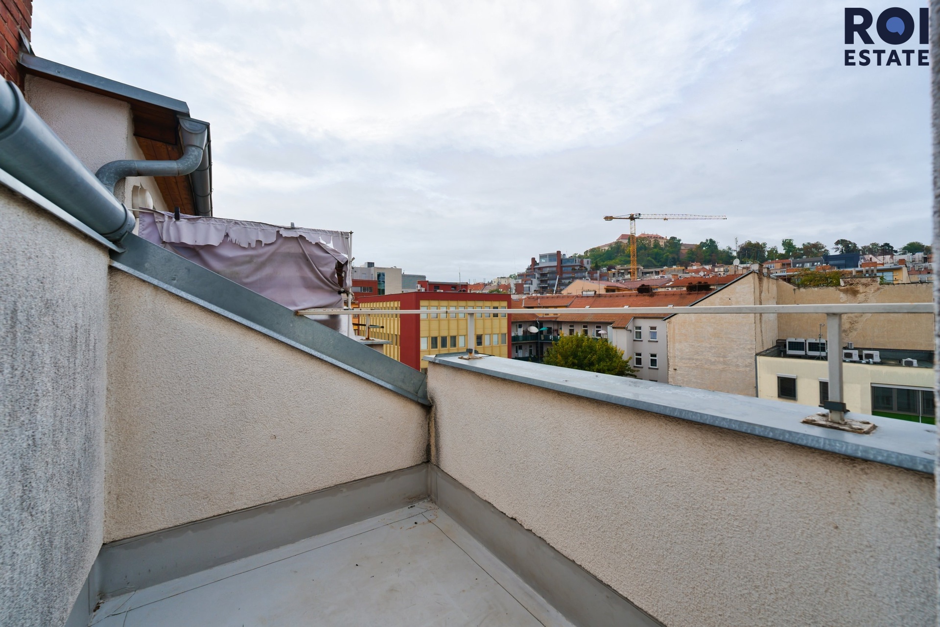 Byt se nachází ve čtvrtém – podkrovním patře udržovaného domu bez výtahu. Dominantou je okno a terasa s výhledem přímo na Špilberk a Petrov, které vám každý den připomene, že bydlíte opravdu v Brně.