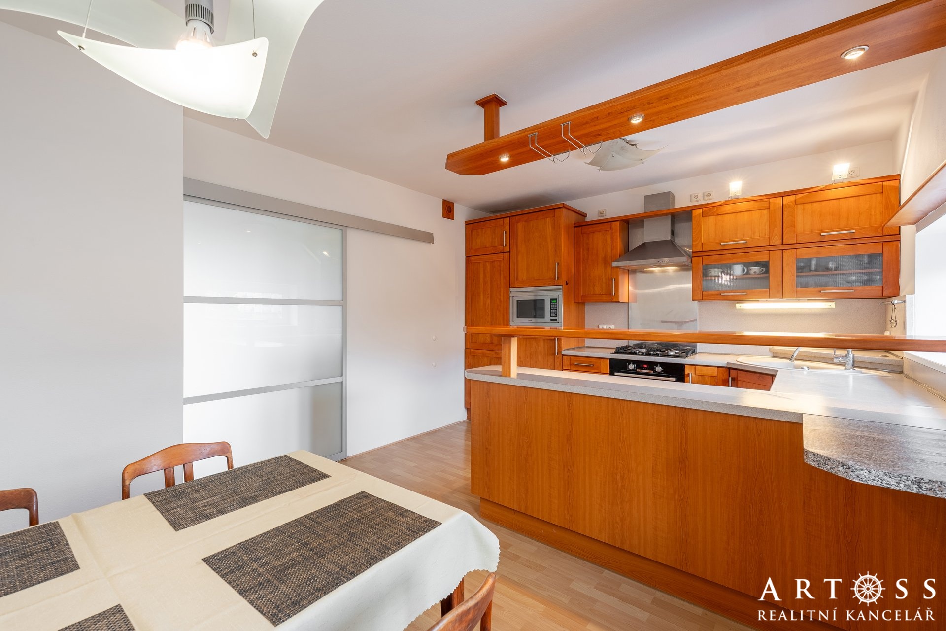 Součástí spodního patra je dále samostatná kuchyně s jídelnou, oddělitelná od ostatního bytového prostoru posuvnými designovými dveřmi. Kuchyňská linka na míru je vybavena plynovou sklokeramickou varnou deskou / je zde možnost i elektrické indukční desky/ a vestavnými spotřebiči – elektrickou troubou, myčkou a lednicí s mrazákem. Dřez je vybaven i drtičem odpadu.