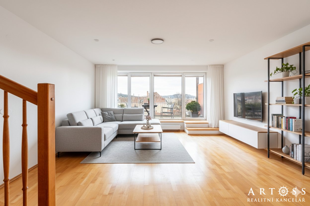 V exkluzivním zastoupení majitele nabízíme k prodeji výjimečný cihlový mezonetový byt 4+1 s terasou a jedinečným výhledem.