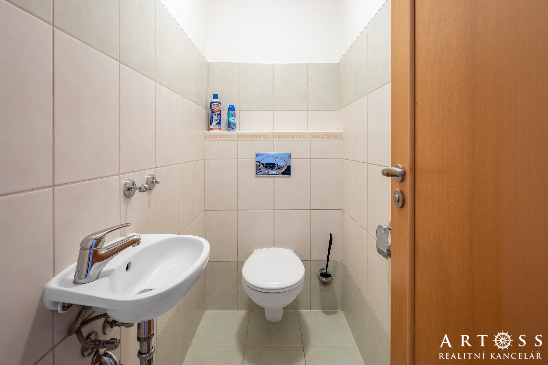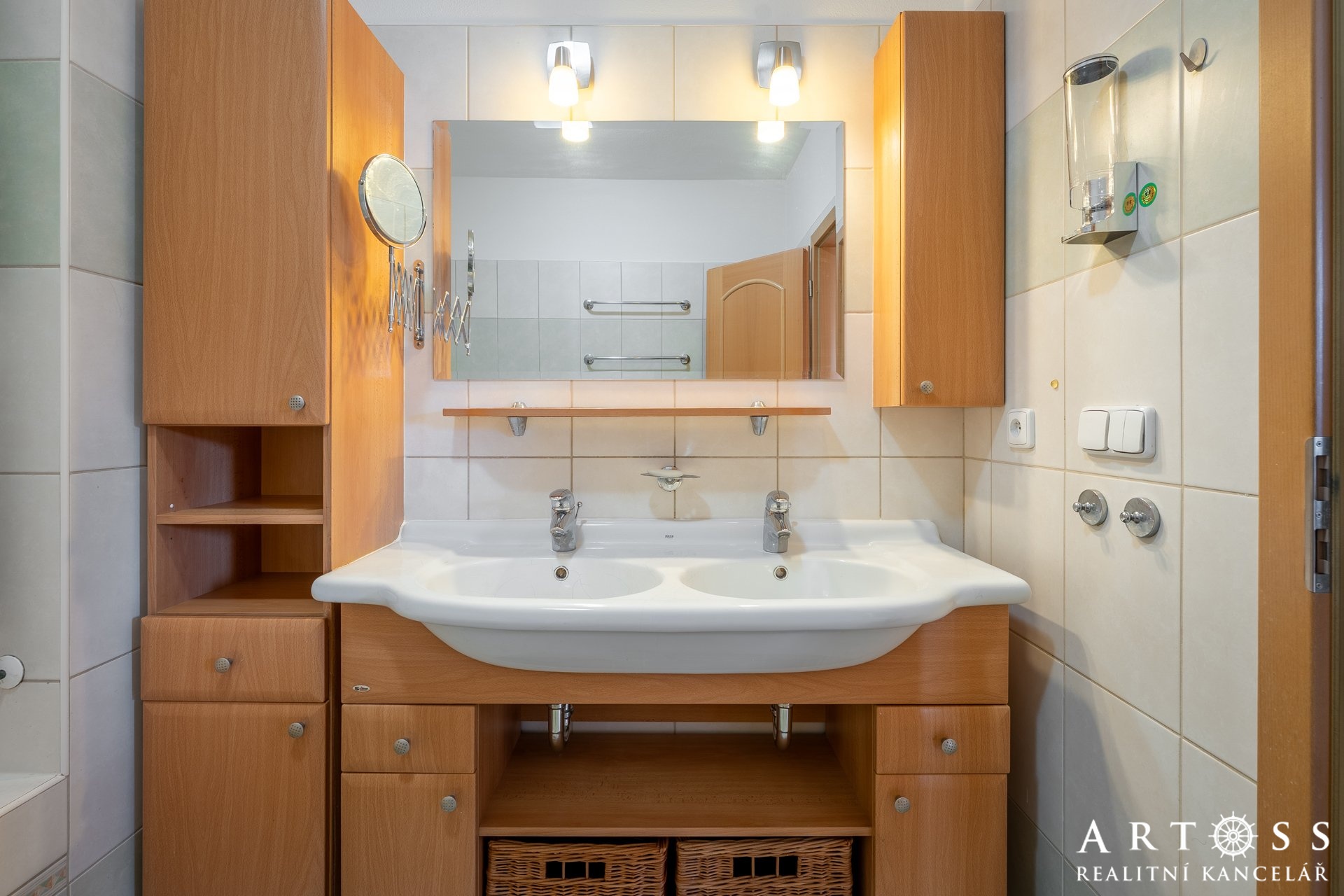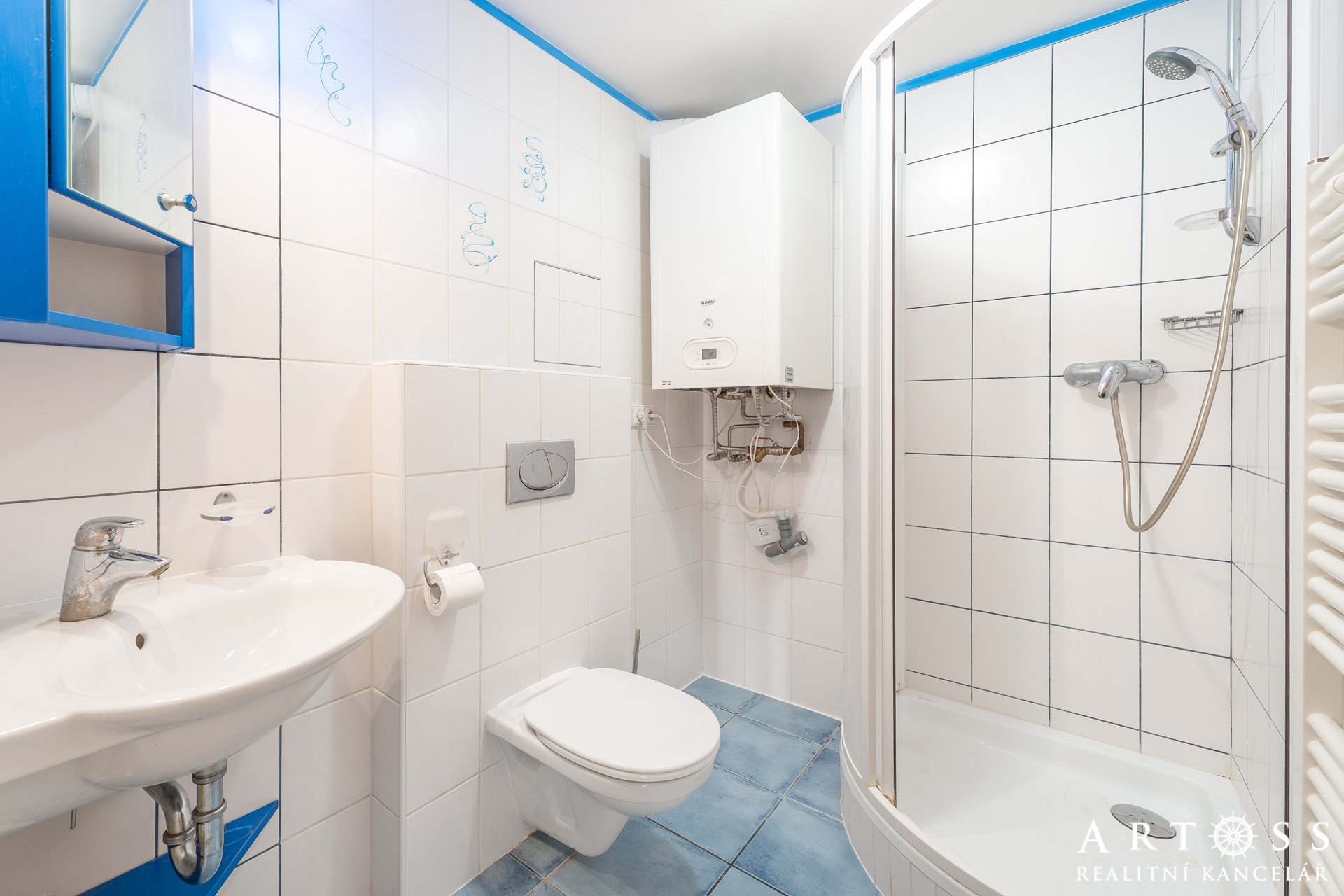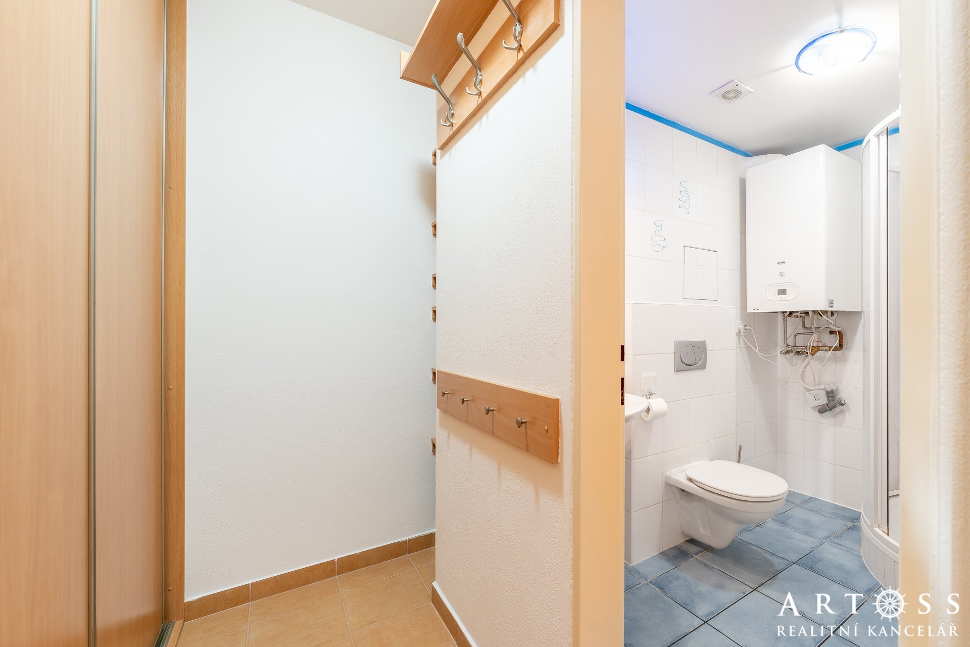 Praktická šatna s vestavnými skříněmi nabízí dostatek úložného prostoru. Koupelna se sprchovým koutem a toaletou, vybavená elektrickým podlahovým vytápěním a otopným žebříkem. Zde je také umístěn plynový kotel, který zajišťuje vytápění a ohřev vody.
