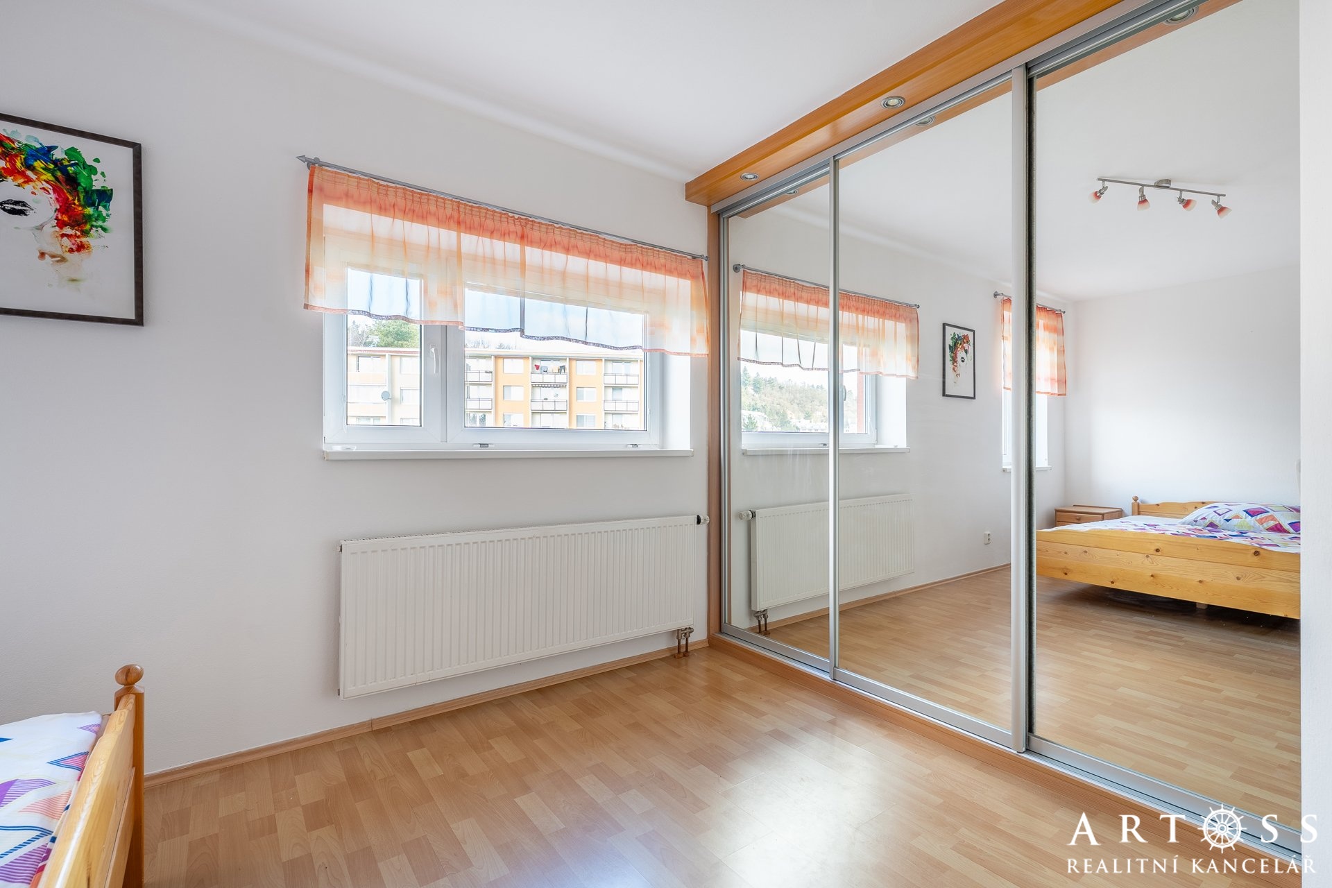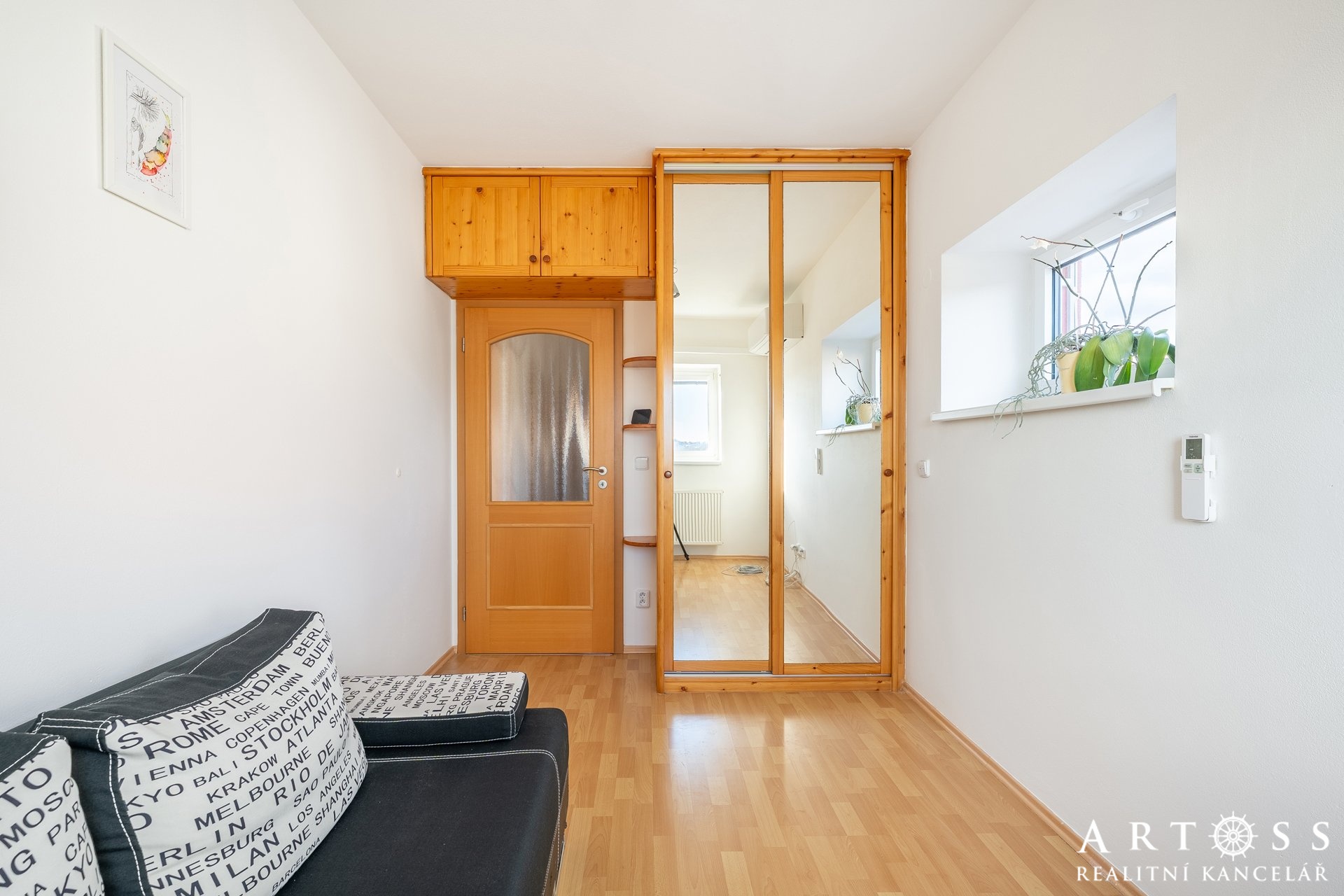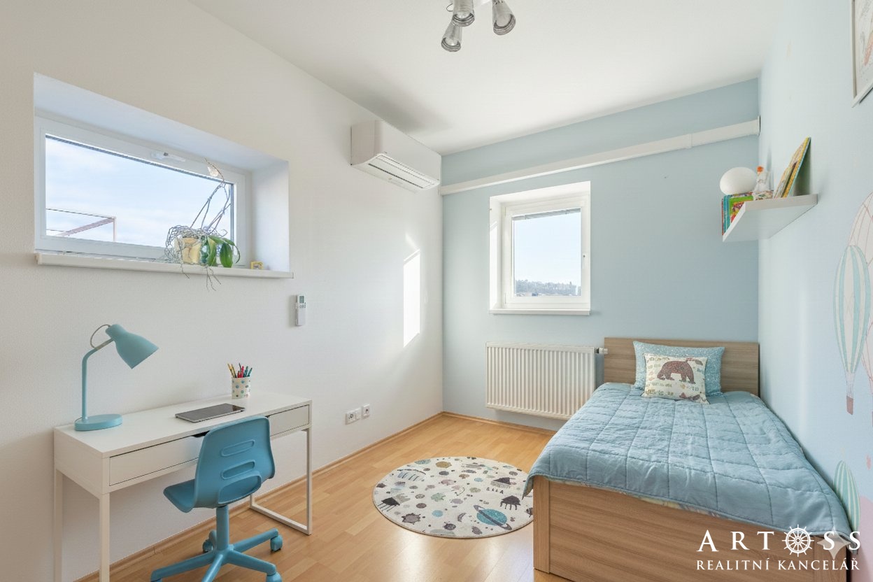 Horní patro slouží jako klidová zóna bytu. Nachází se zde ložnice a dva další pokoje, které poskytují dostatek soukromí každému členu domácnosti. Velkým benefitem je klimatizace ve všech pokojích v horním patře, která výrazně zvyšuje komfort zejména v letních měsících. V ložnici a jednom z dětských pokojů jsou vestavné skříně. V patře je druhá koupelna s vanou, opět s elektrickým podlahovým vytápěním a otopným žebříkem a samostatnou toaletou s malým umyvadlem. Obě podlaží propojuje elegantní dřevěné schodiště.