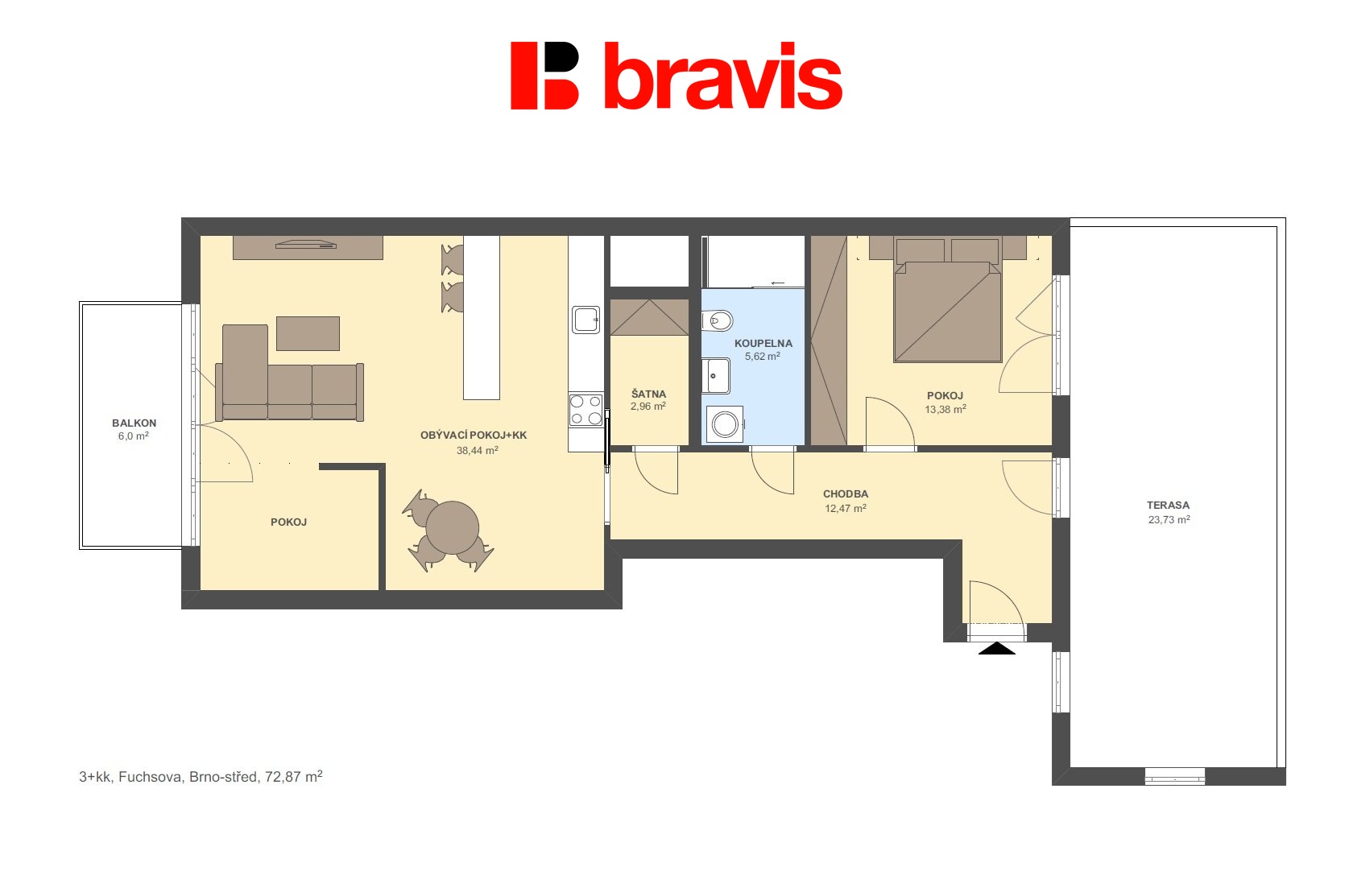 Bytová jednotka o celkové ploše 76 m² disponuje terasou 24 m², balkonem 6 m² a sklepem a je situována ve 3. nadzemním podlaží polyfunkčního domu na ulici Fuchsova, jen několik kroků od katedrály sv. Petra a Pavla či hradu Špilberk.