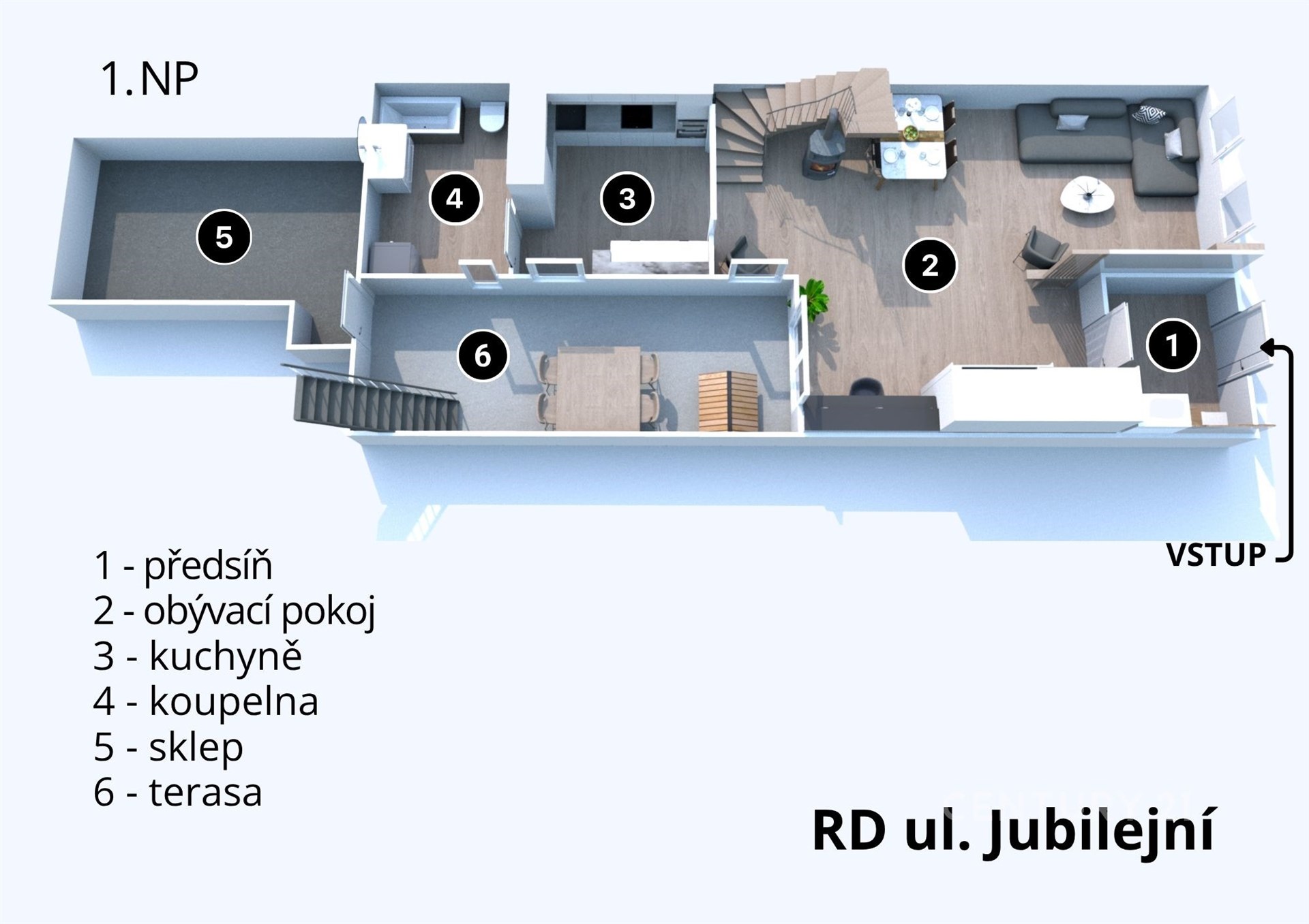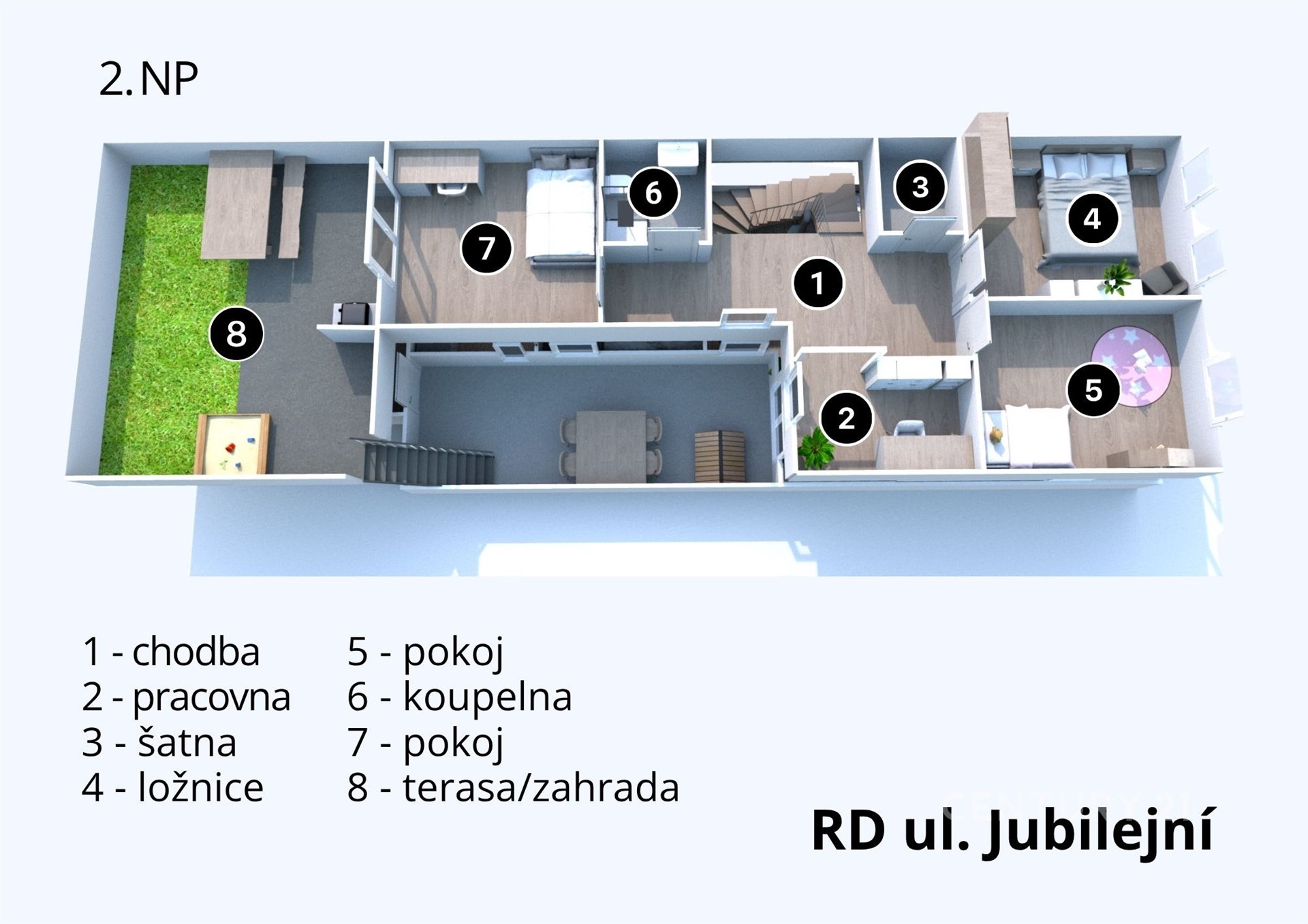 Dům nabízí komfortní zázemí pro každodenní rodinný život i chvíle, kdy si chcete doma opravdu odpočinout. Velkým benefitem je také soukromý venkovní prostor, který vybízí k posezení, grilování nebo klidnému večeru venku bez zbytečné údržby.