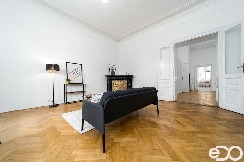 127 m² plus sklep, stropy téměř čtyři metry, světlo opírající se o původní parkety a krb, který tvoří přirozené centrum celého bytu.