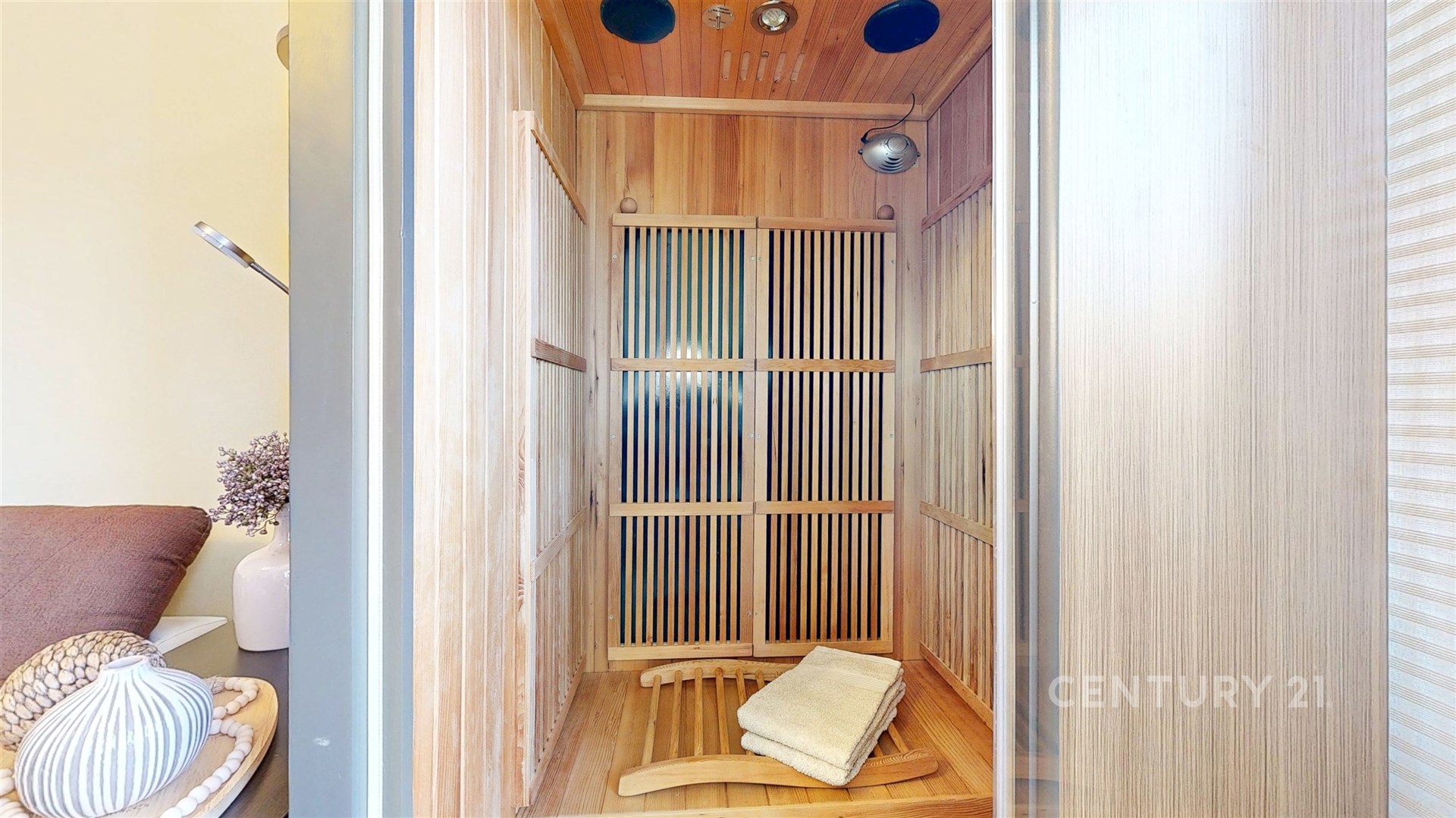 Vybavení obývacího pokoje saunou, samostatná šatna, prostorná terasa, velký sklep i podíl na společně užívané zahradě, umocňují komfort bydlení v této účelně řešené bytové jednotce.