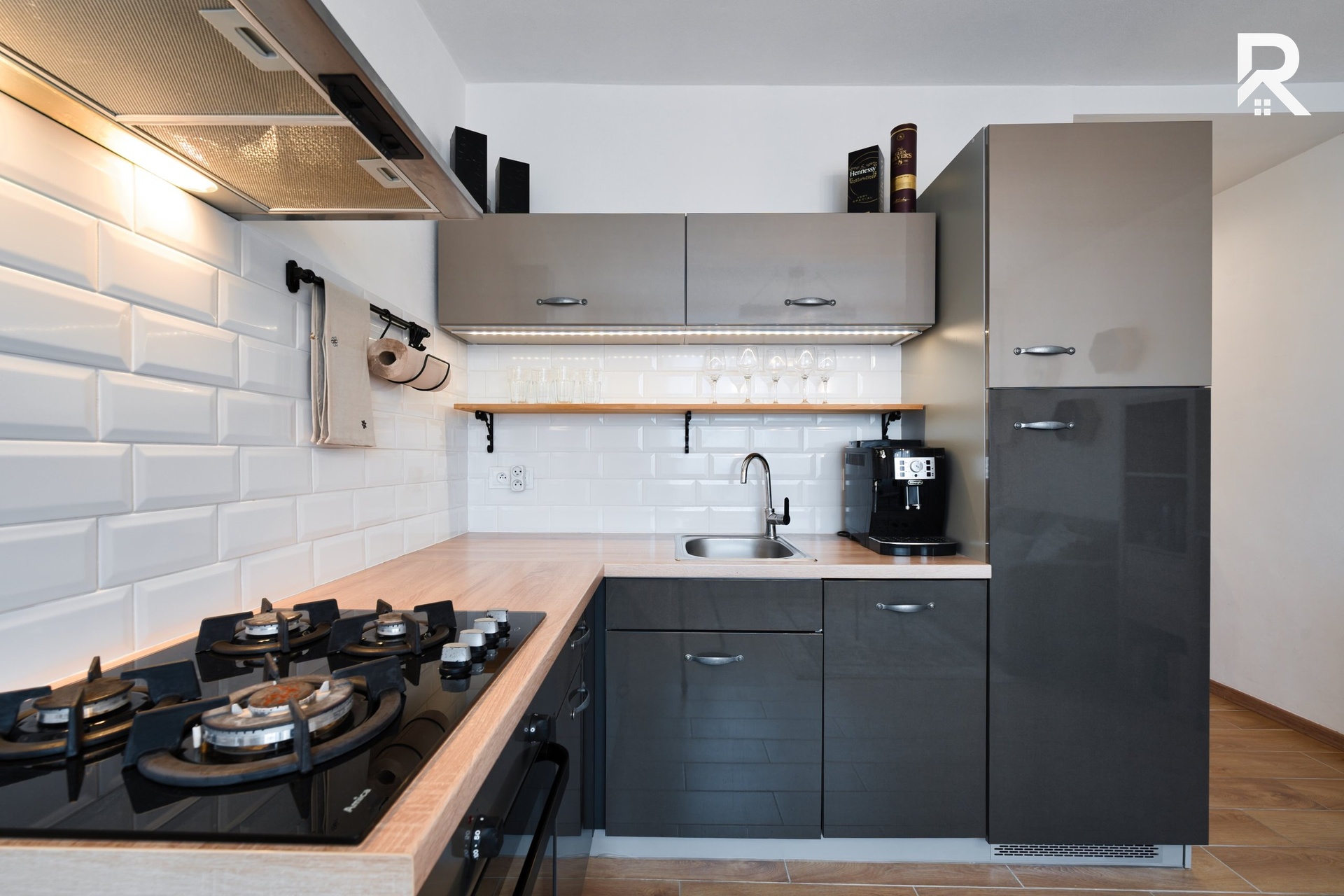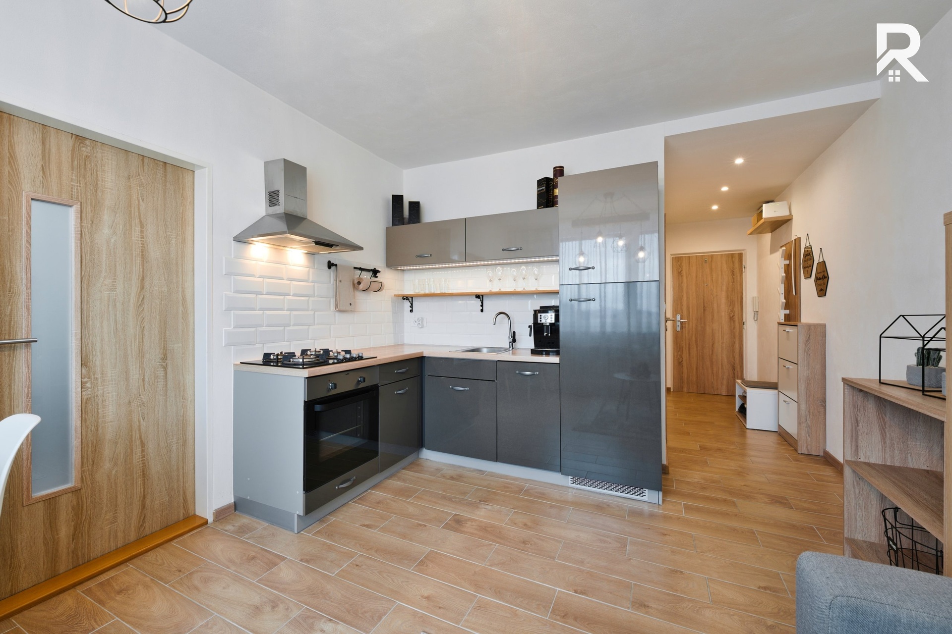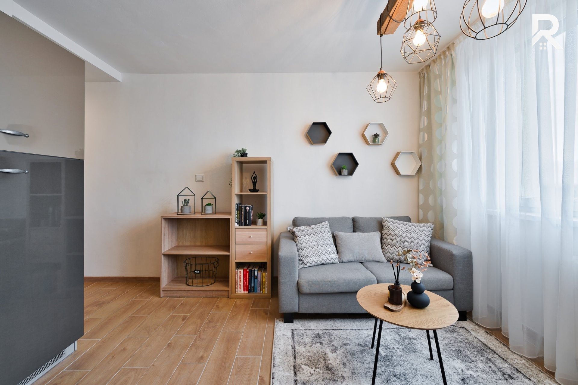 Chodba ústí do světlého obývacího prostoru s kuchyňským koutem, kde majitel při rekonstrukci nešetřil nápady ani kvalitou. Design a promyšlené barevné kombinace vytváří příjemnou atmosféru, ve které se budete cítit opravdu skvěle. Kuchyňská linka je plně vybavená spotřebiči – najdete tu myčku, lednici s malým mrazákem, elektrickou troubu i plynovou varnou desku. V prostoru je dostatek místa na pohodlné posezení s televizí, menším křeslem i stolem. Z obývacího pokoje plynule přecházíte do ložnice, která pojme nejen prostornou postel, ale i šatní skříň a pracovní kout.