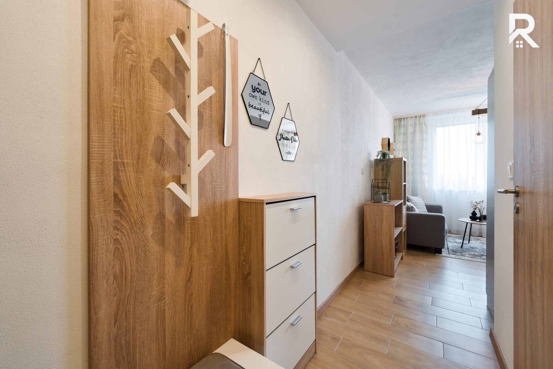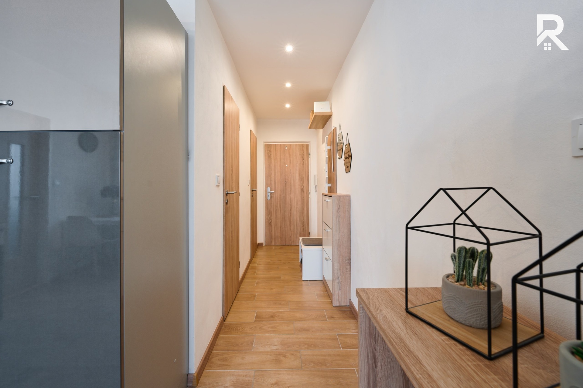 Hned po vstupu do bytu vás přivítá prostorná chodba, která vás přirozeně provede celým bytem. Momentálně tu najdete menší botník a praktickou stěnu na kabáty, ale prostor je natolik variabilní, že zde snadno vzniknou vestavěné skříně nebo jakékoli jiné úložné řešení podle vašich představ. Z chodby vedou dvě místnosti, přičemž jedna z nich, technická místnost, není na fotografiích. Zde najdete prostor pro pračku i sušičku, ale také dostatek místa pro uskladnění potravin, vysavače či úklidových pomůcek jako mop a další. Dále pak také stylová koupelna s moderním sprchovým koutem a závěsným WC. Díky nové dispozici a kompletní rekonstrukci je koupelna dostatečně prostorná a poskytuje maximální komfort pro každodenní užívání.