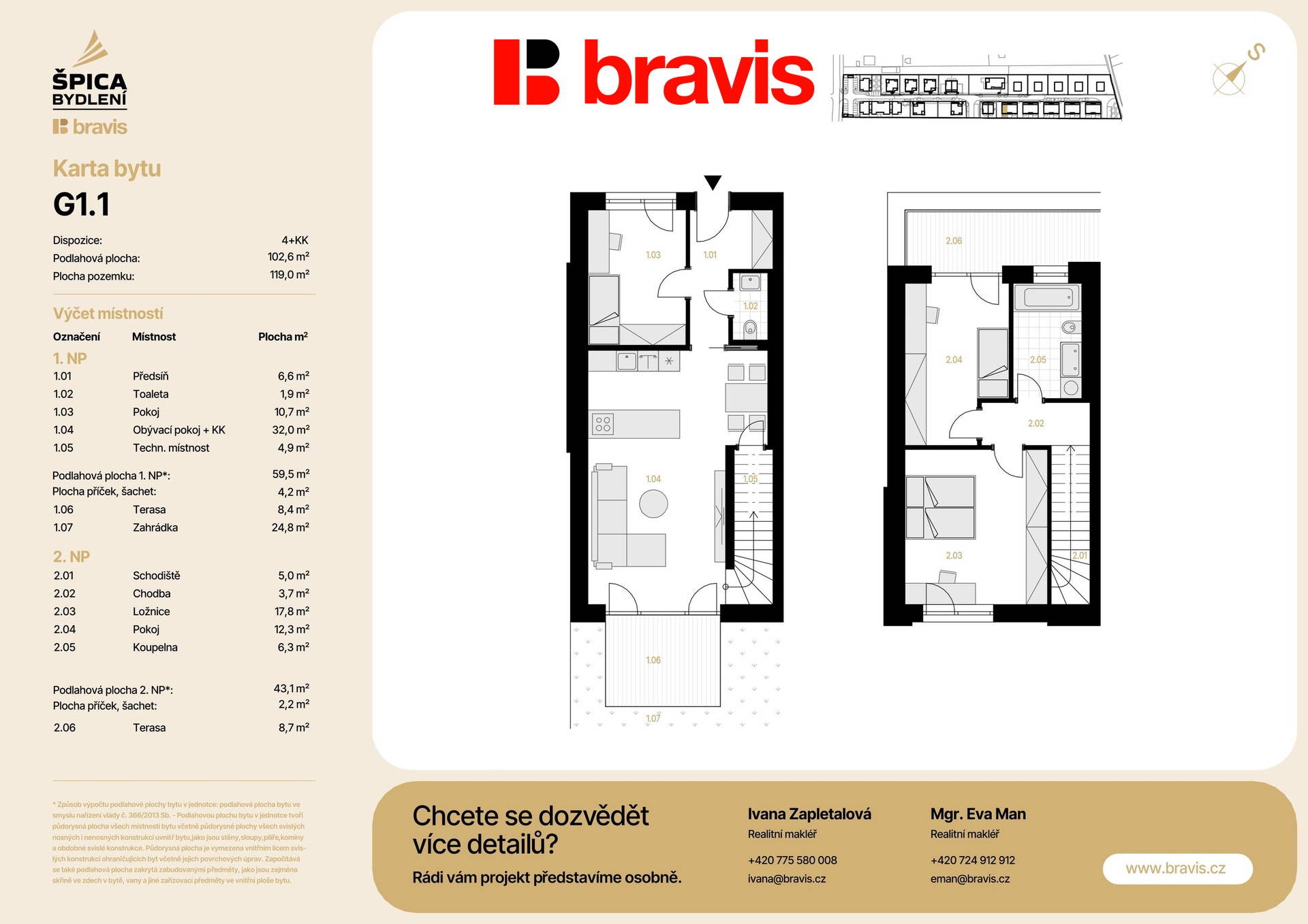 Nabízíme exkluzivní mezonetovou jednotku 4+kk v rodinném domě (bytová jednotka G1-1), v novém projektu Špica bydlení — byt umístěný ve viladomě G1, kde jsou celkově 3 bytové jednotky. Celková podlahová plocha 102,6 m2 s terasou 17,4 m2, zahrádkou 24,8 m2 a vlastní parkovací stání, to vše v ceně vilabytu.