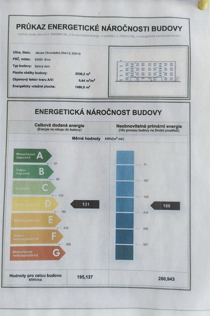 - Ukazatel energetické náročnosti budovy: 131 kWh/m²