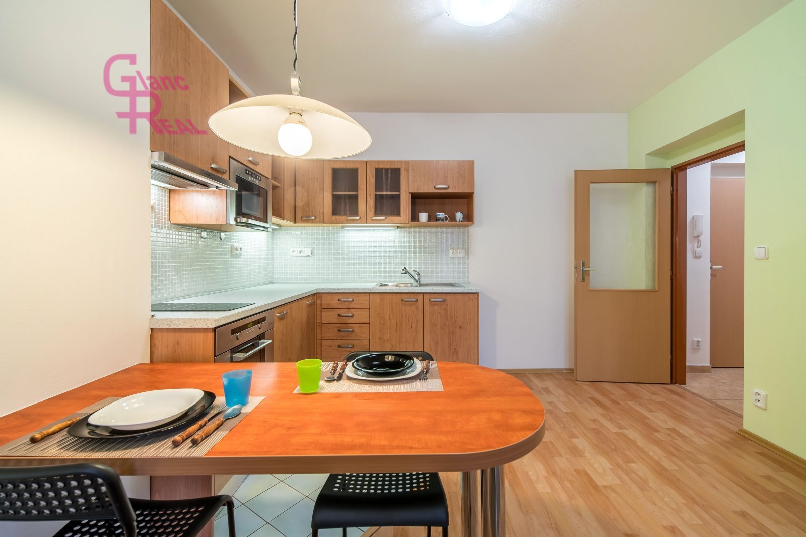 Obývací pokoj je propojen s kuchyňským koutem. Kuchyňská linka je vybavena spotřebiči: lednicí, sklokeramickou varnou deskou, elektrickou troubou a digestoří. Z ložnice je vstup na balkon orientovaný do klidného vnitrobloku.