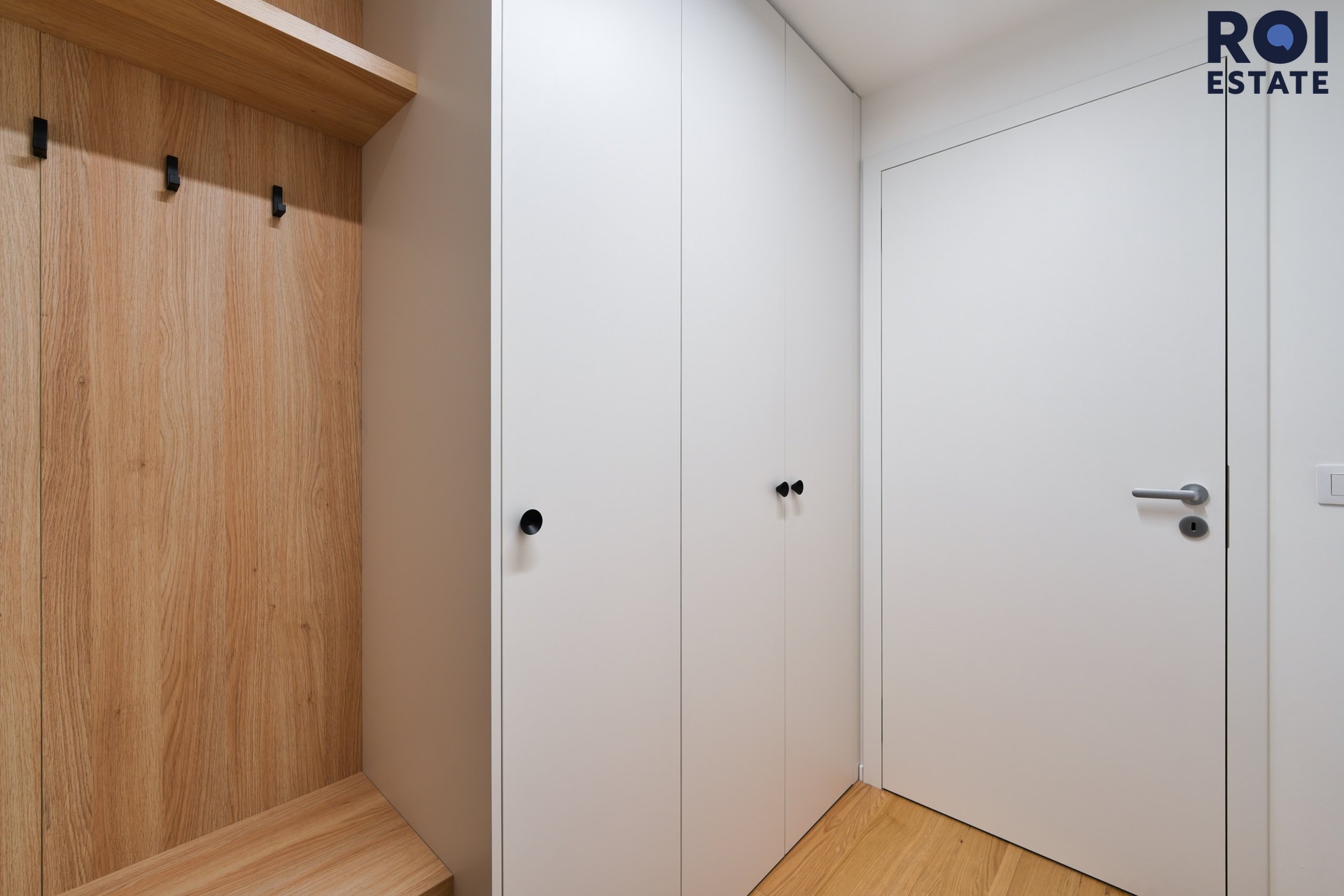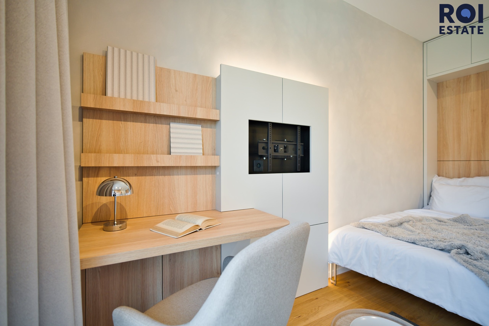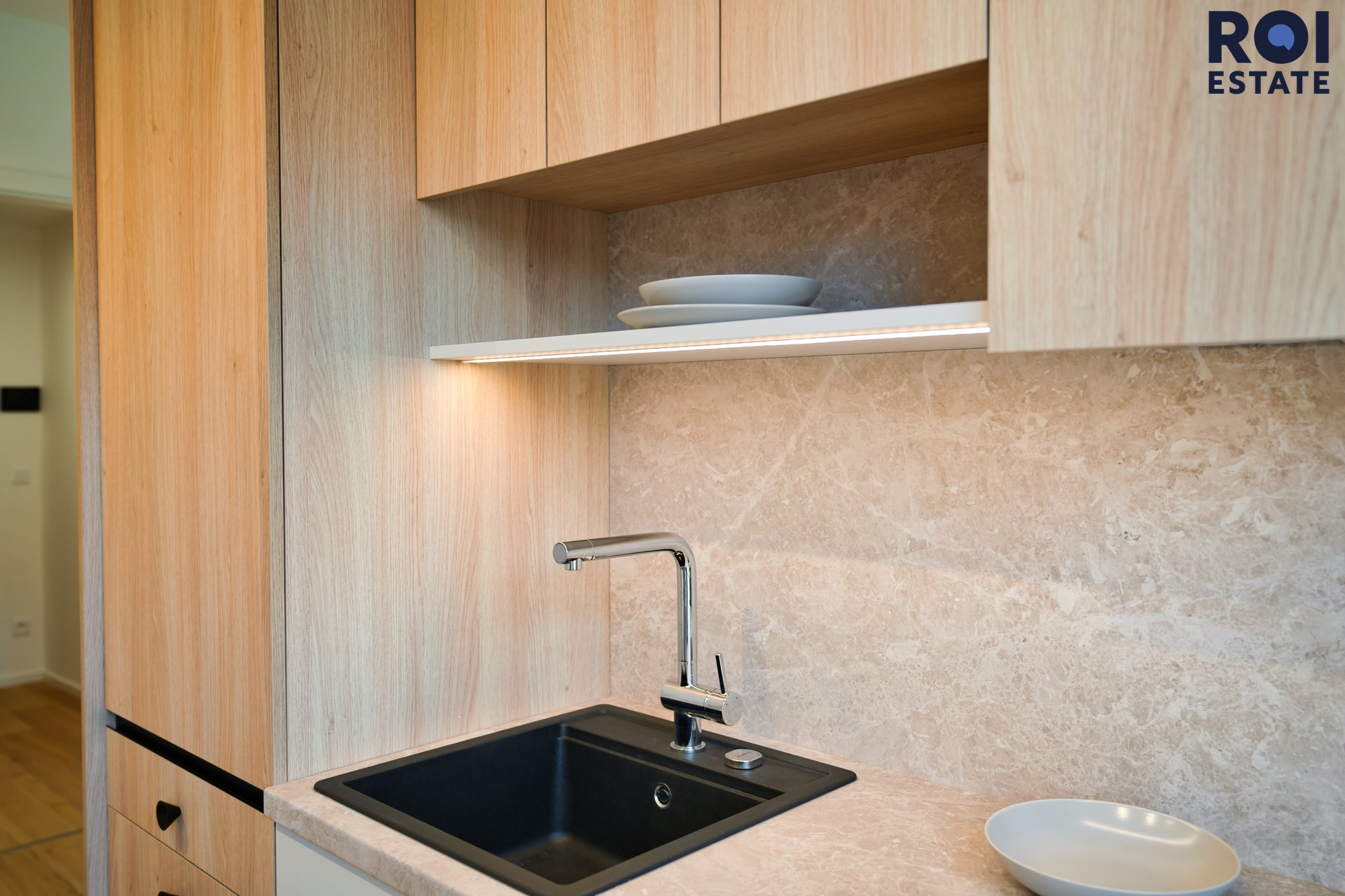 Interiér působí lehce, harmonicky a příjemně teple díky kombinaci přírodního dřeva, světle šedých tónů a jemného ambientního osvětlení. Kuchyňská linka je plně vybavená vestavnými spotřebiči, nechybí indukční varná deska, trouba, digestoř ani chladnička. Promyšlené úložné prostory přirozeně navazují na obytnou zónu s pracovním koutem, který působí elegantně i prakticky zároveň.