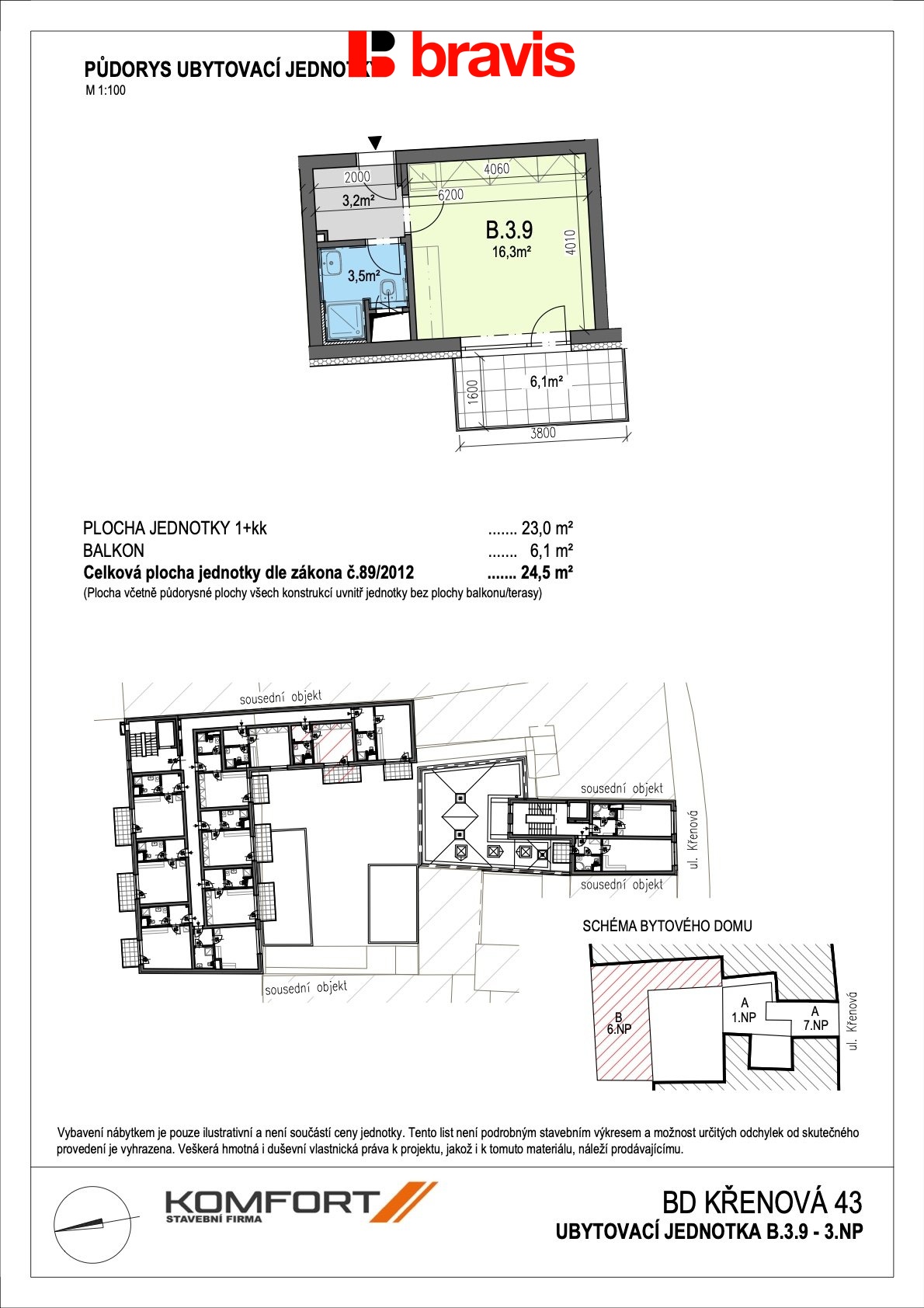 Byt o výměře 23 m2 se nachází ve 3. nadzemním podlaží novostavby s výtahem. Součástí bytu je i prostorný balkon o ploše 6 m2.