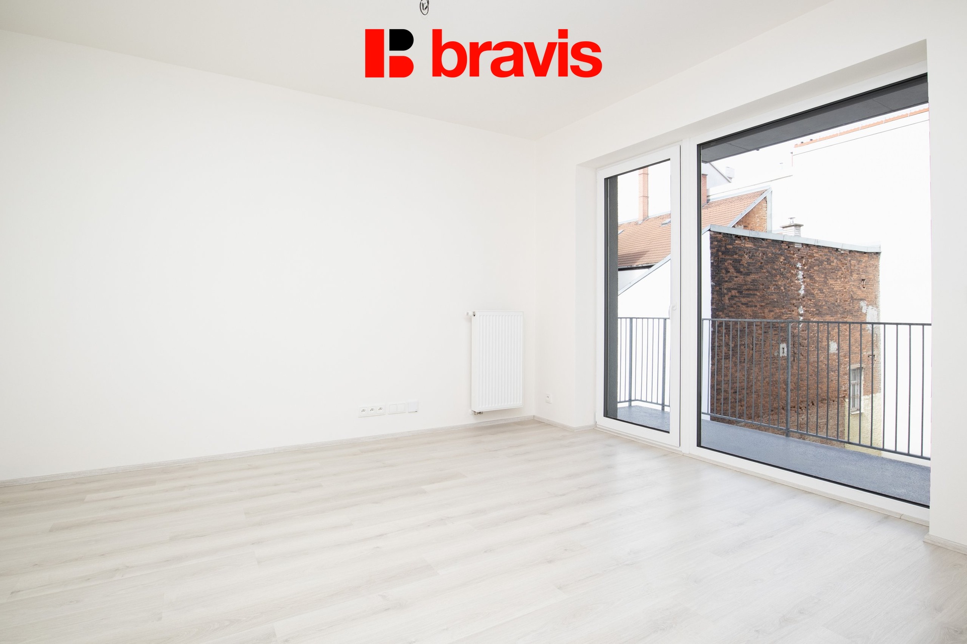 Pronájem bytu 1+kk, Brno - Trnitá, ul. Křenová, novostavba, balkon, výborná dostupnost do centra