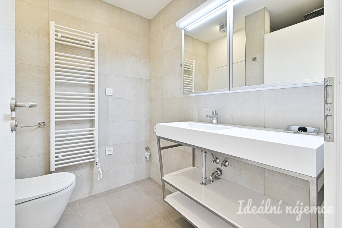 Součástí bytu je nová kuchyňská linka vybavená troubou, digestoří a indukční varnou deskou. Byt se pronajímá nezařízený. Koupelna je moderní a disponuje sprchovým koutem, přičemž toaleta je součástí koupelny.