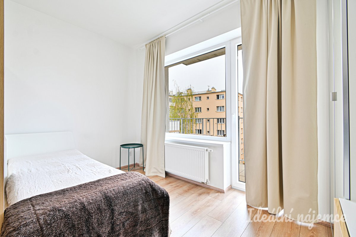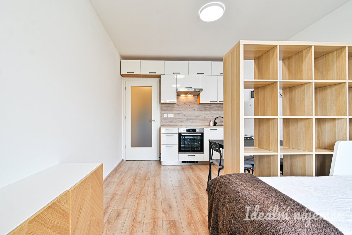 Hlavní obytný prostor tvoří světlý pokoj s kuchyňským koutem a vstupem na balkon. Kuchyně je vybavena spotřebiči, konkrétně lednicí, myčkou, mikrovlnnou troubou, troubou a dvouplotýnkovou indukční deskou. V obytné části zůstává také postel a šatní skříň, v koupelně pak pračka. Byt je tak připraven k nastěhování bez nutnosti dalších větších investic.