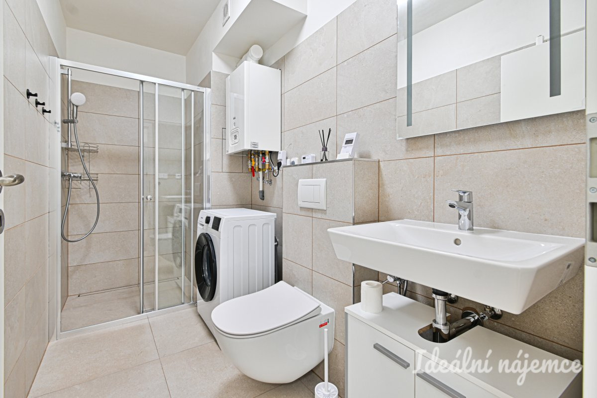 Koupelna je vybavena sprchovým koutem, umyvadlem, pračkou a toaletou. Součástí bytu je také vstupní chodba s místem pro úložné prostory.