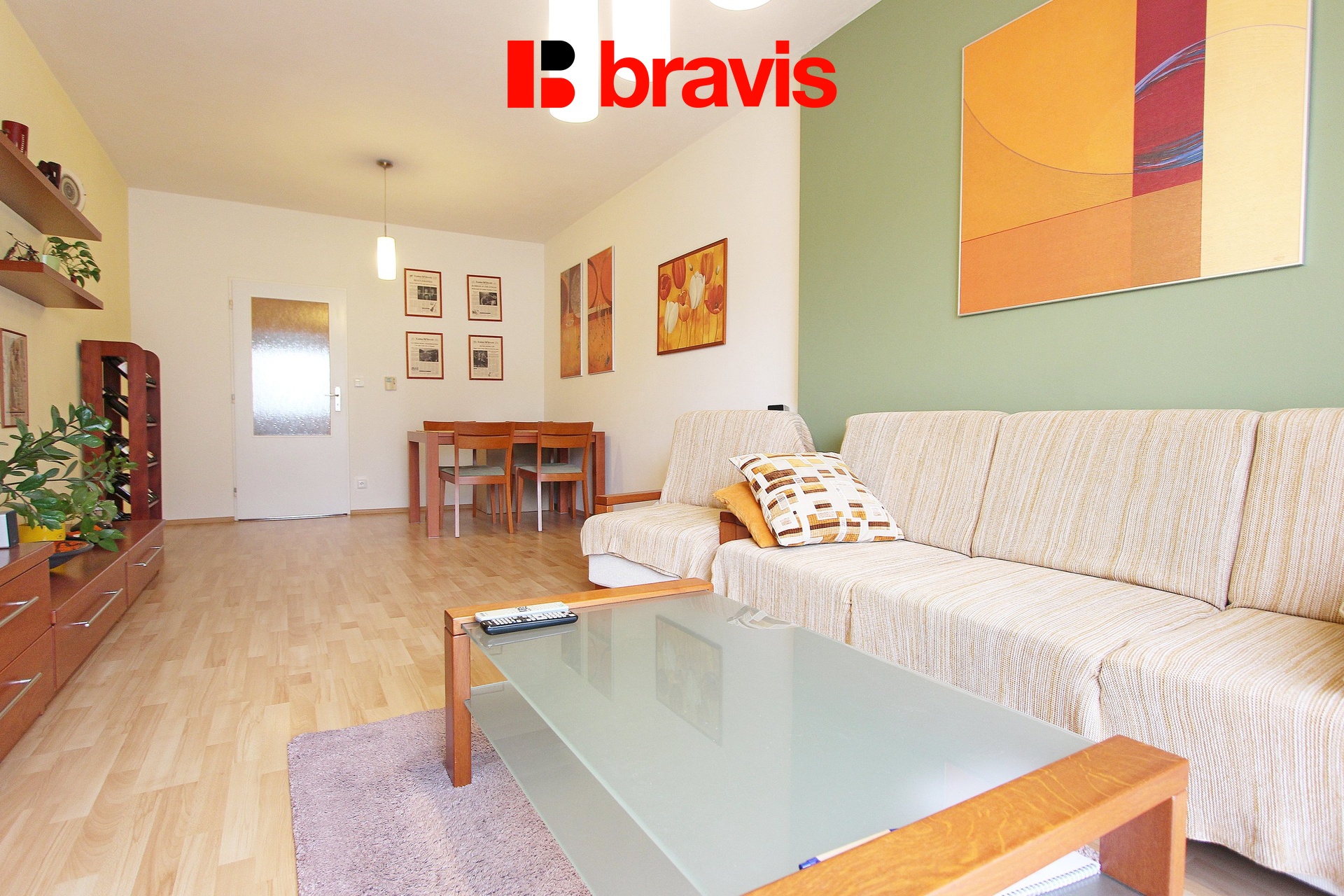 V obývací části je sedací souprava s konferenčním stolkem, TV stěnou a jídelním stolem s židlemi. Odtud je vstup na balkon.