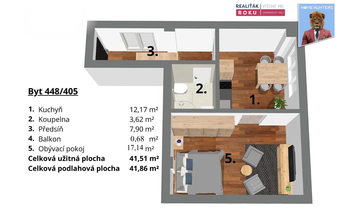 | Dispozice/podlahová plocha: | 2+kk/42 m² |