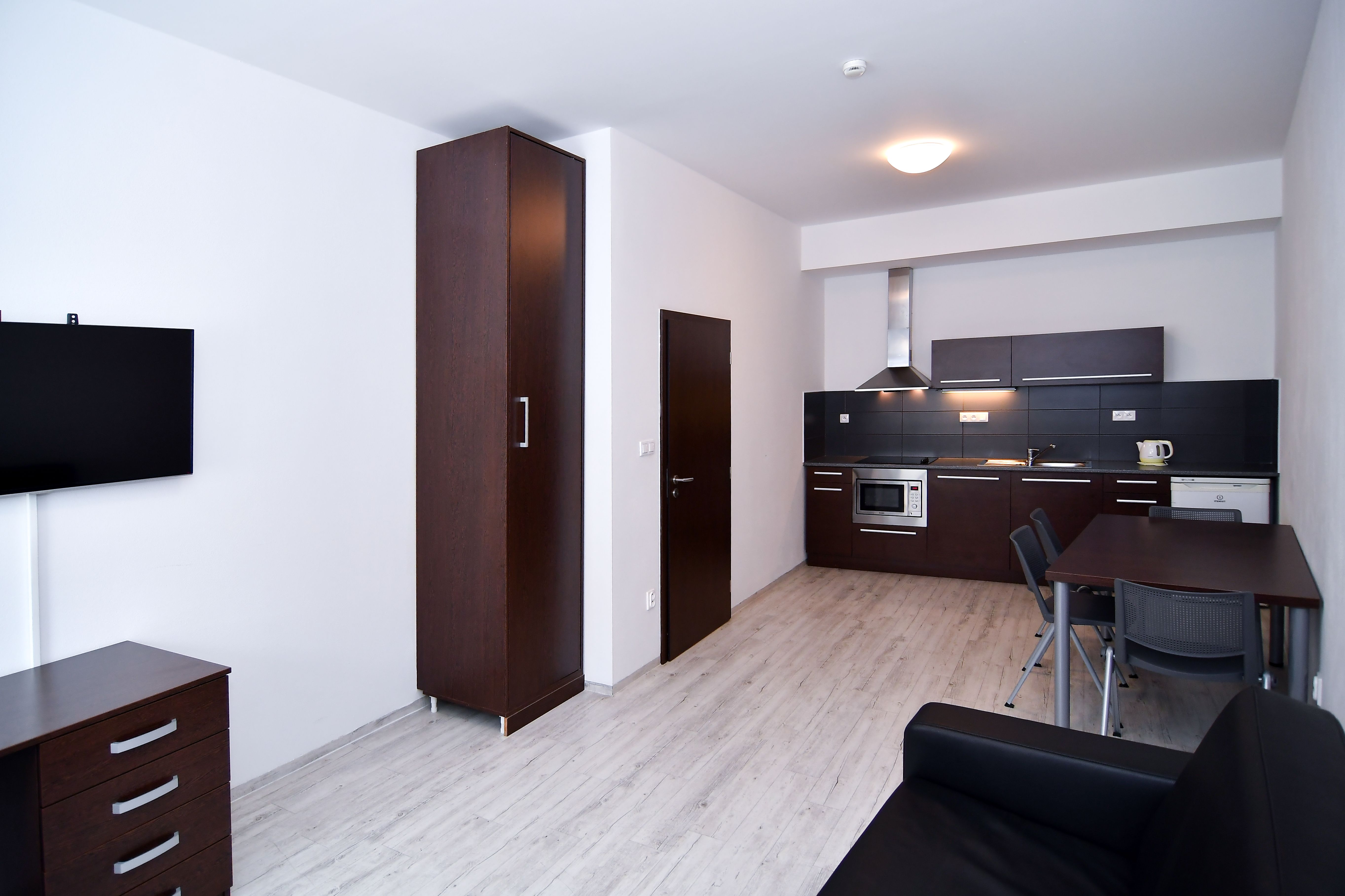 Byty 2+kk jsou o výměře 45,09 až 46,3 m2 a nacházejí se ve 2.-5. podlaží. Budova je opatřena výtahem i schodištěm Byt má vstupní chodbu vybavenou vysokou šatní skříní s celoplošným zrcadlem a pokojovým trezorem. Dále byt disponuje obývací částí s rozkládací sofa, moderní vybavenou kuchyňskou linkou s pracovní deskou, podstavnou lednicí Indesit, vestavěnou mikrovlnou trouba s grilem a horkovzdušnou troubou, varnou konvicí a jídelní soupravou s nádobím pro 4 osoby. Pokoj je vybavený jídelním stolem se 4 židlemi, pracovním stolem s kancelářskou židlí a smart TV. Ložnice je samostatná se 2 komfortními postelemi a šatní skříní. Podlaha je vinylová, nebo s kobercem. Koupelna je s vanou, umyvadlem, wc a topným žebříkem. WiFi připojení se standardní rychlostí dat je již v ceně pronájmu.