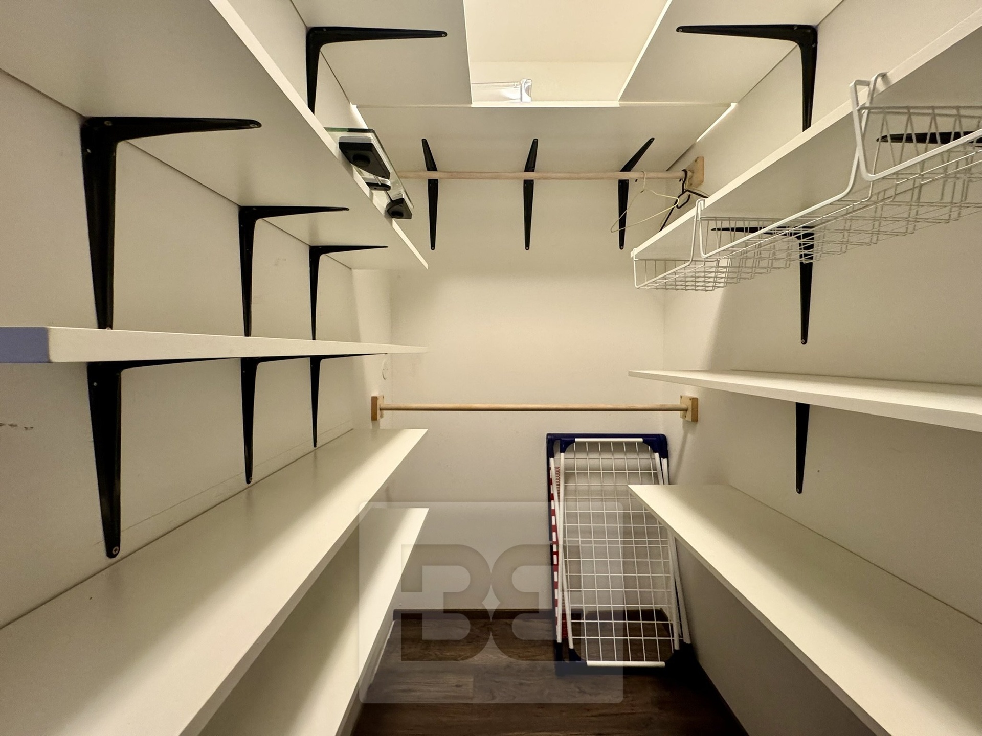 Dále je k dispozici samostatná ložnice s šatnou, která poskytuje dostatek úložného prostoru. Byt je celkově laděn do moderního a elegantního stylu, působí velmi příjemně a nadčasově.