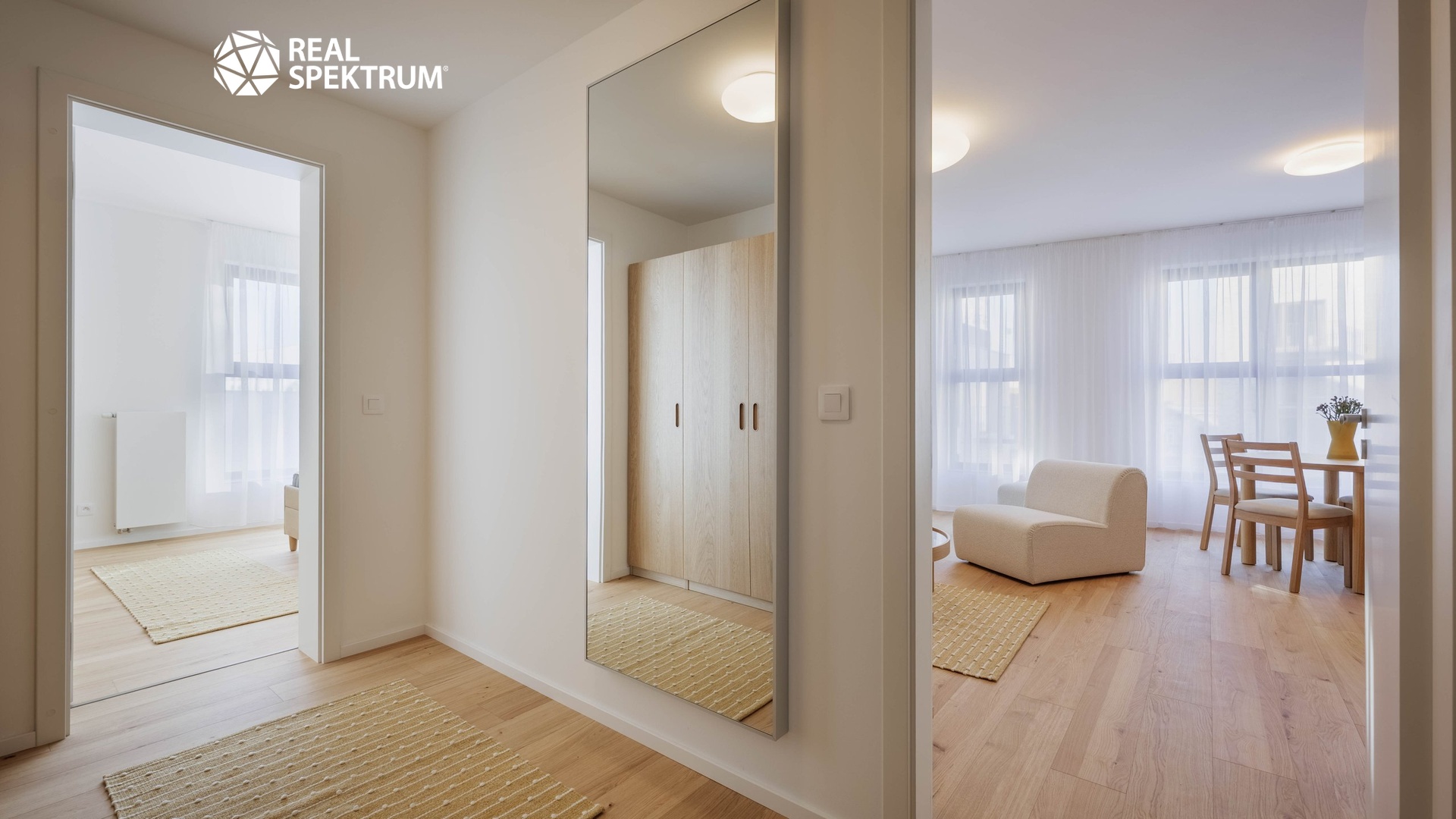 Interiér je vybaven kuchyňskou linkou se spotřebiči a kompletním nábytkem. Úložné prostory jsou řešeny chytře, interiér je vzdušný, čistý, nadčasový a designově velmi povedený. Celková atmosféra bytu je příjemná — působí jako moderní a útulné místo, kde se člověk okamžitě cítí dobře.
