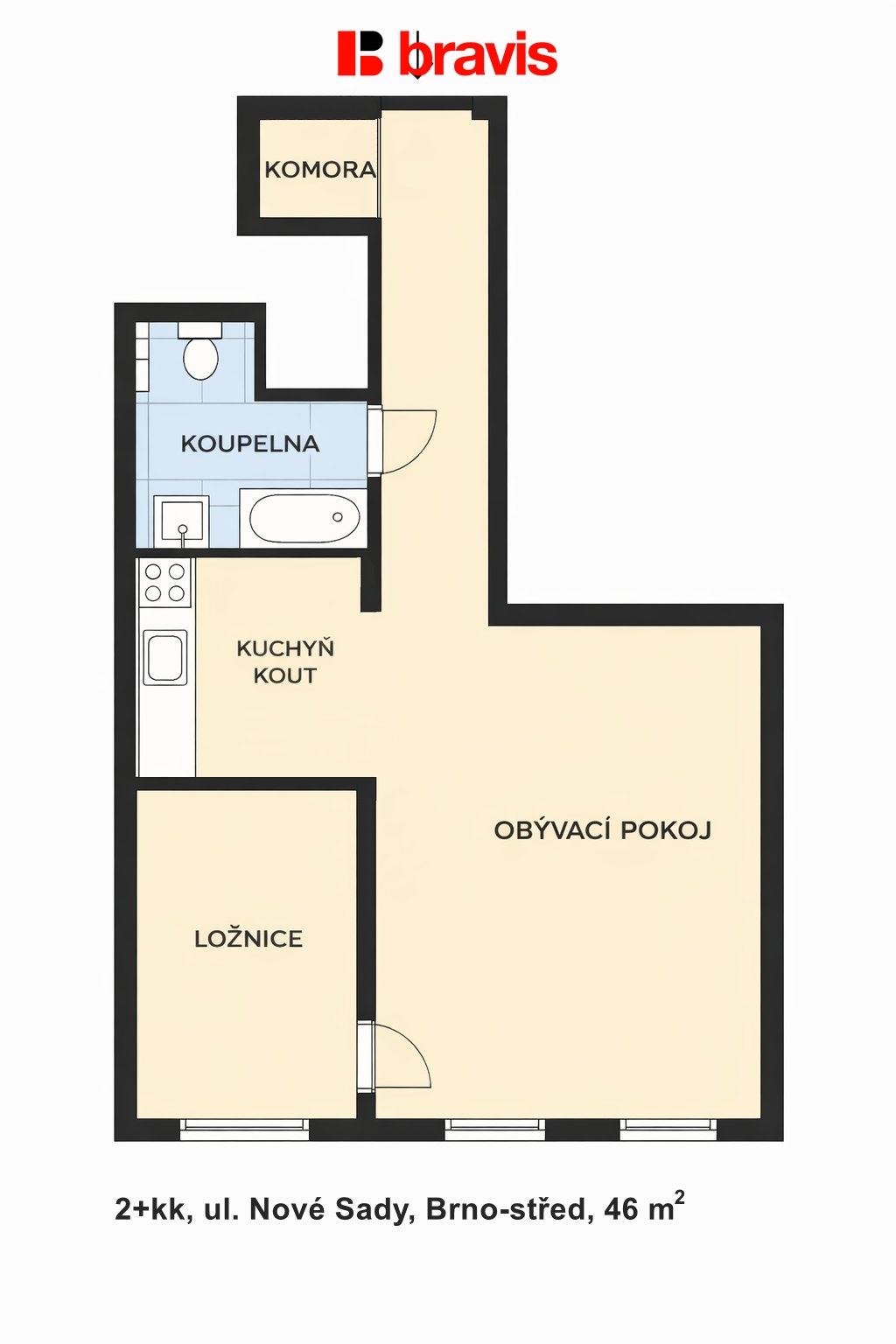 Celková plocha bytu činí 46 m², orientace bytu je do ul. Nové Sady.