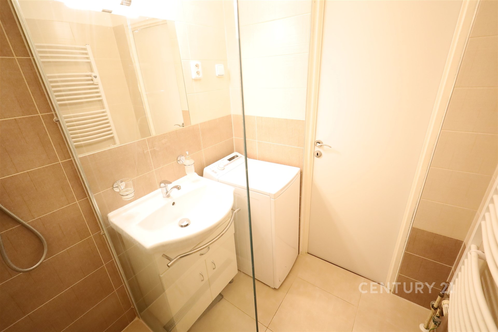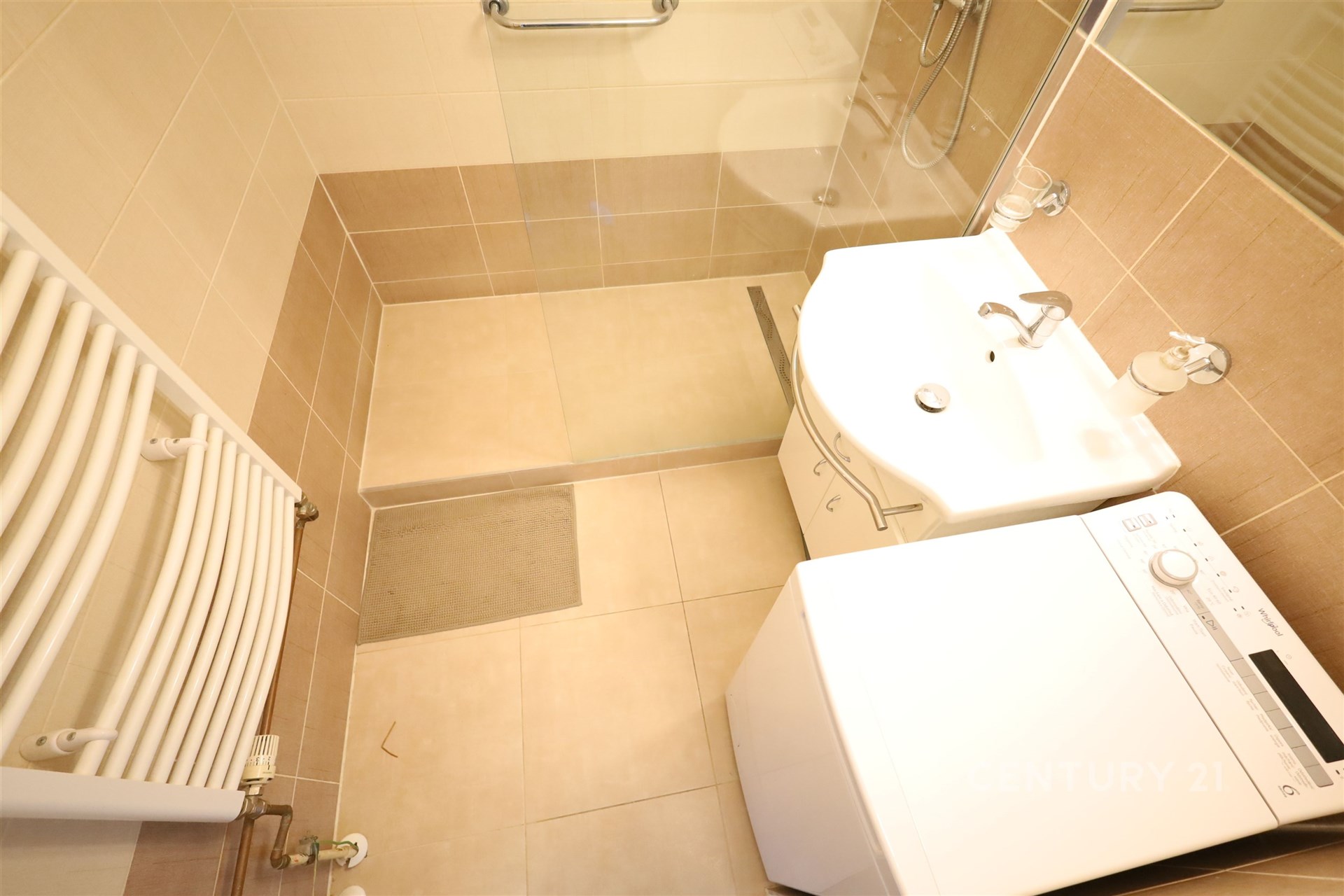 Koupelna je vybavena sprchovým koutem, umyvadlem s koupelnovou skříňkou a topným žebříkem. Je zde umístěna i pračka.