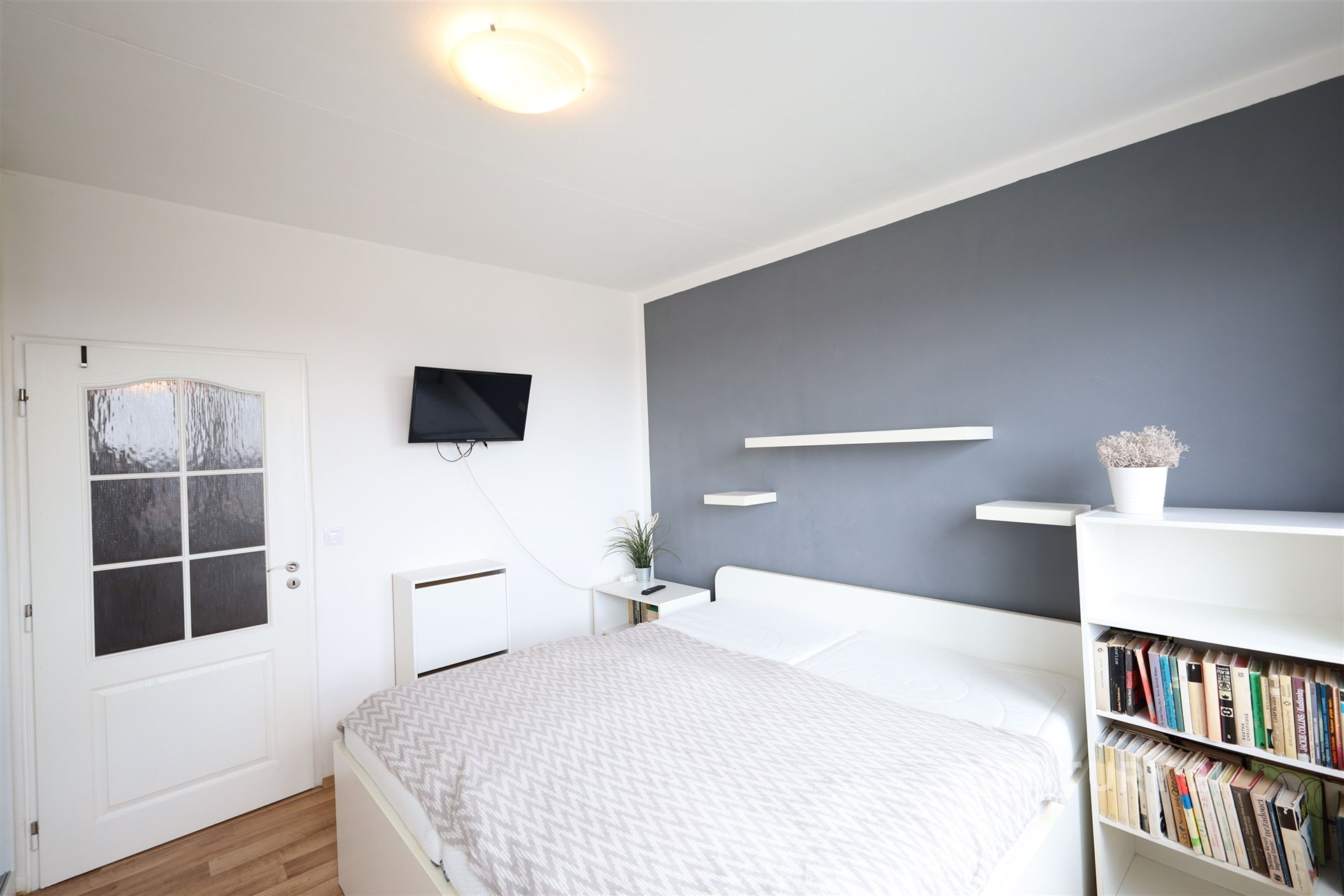 Ložnice je vybavena manželským lůžkem, prostornou vestavěnou skříní, televizorem, knihovnou, stolkem a komodou.