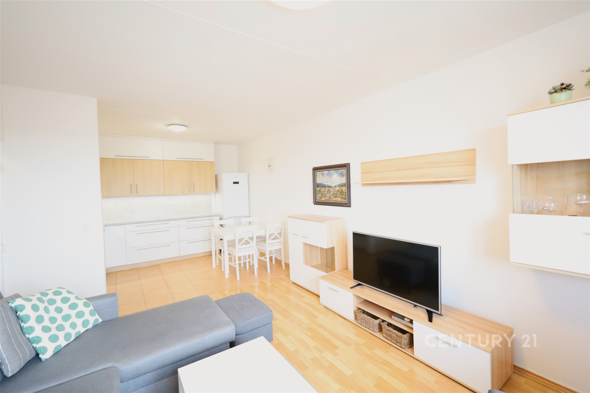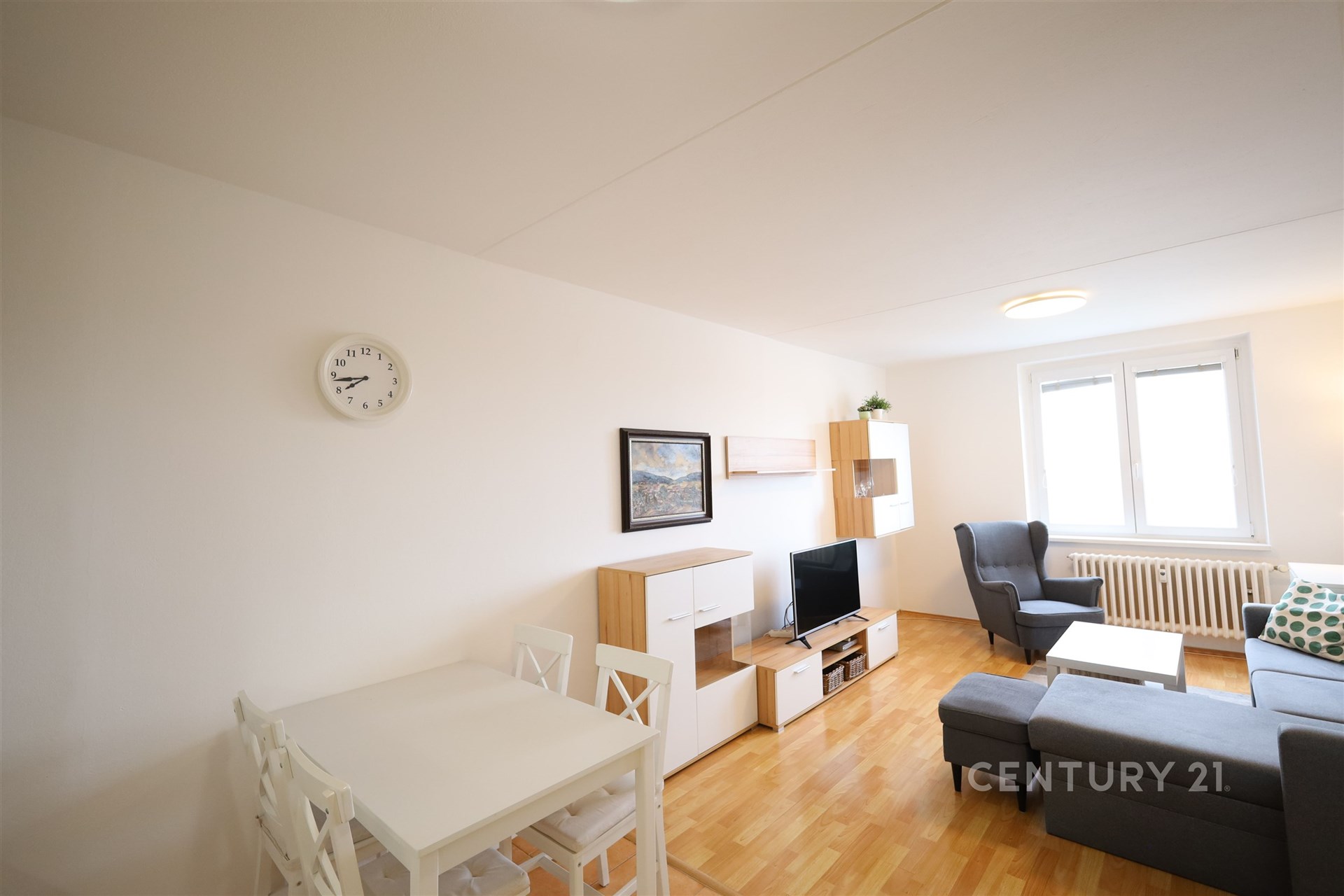 Obývací část doplňuje jídelní stůl se židlemi, nábytková sestava ve světlých tónech, která působí vzdušně, třídílná sedačka, křeslo, stolek, komoda a televizor. K dispozici je i stůl a čtyři židle.