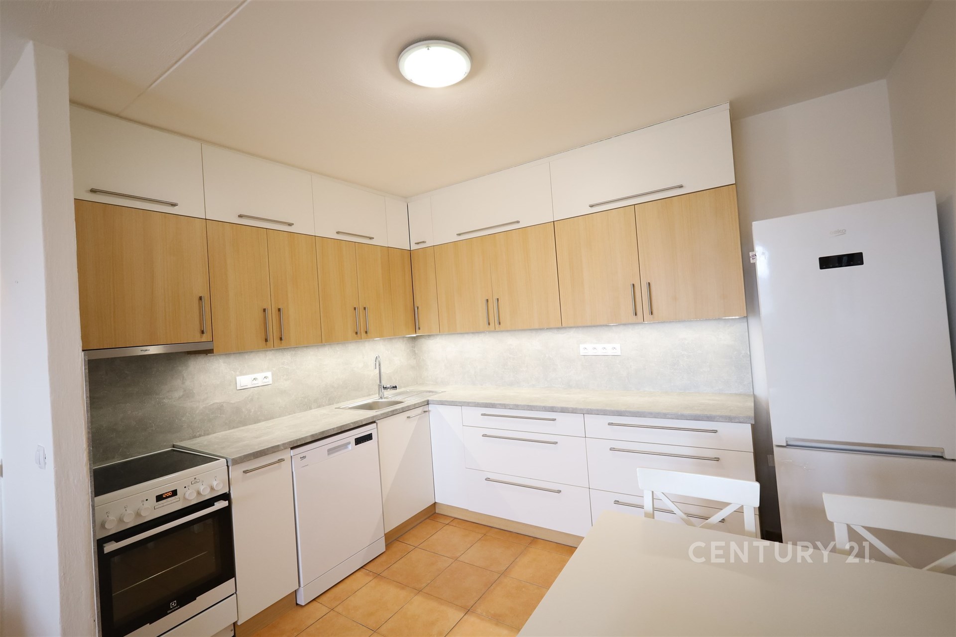 Součástí bytu je vkusná a praktická kuchyňská linka se sporákem s elektrickou varnou deskou a troubou, myčkou, digestoří a lednicí s mrazákem.